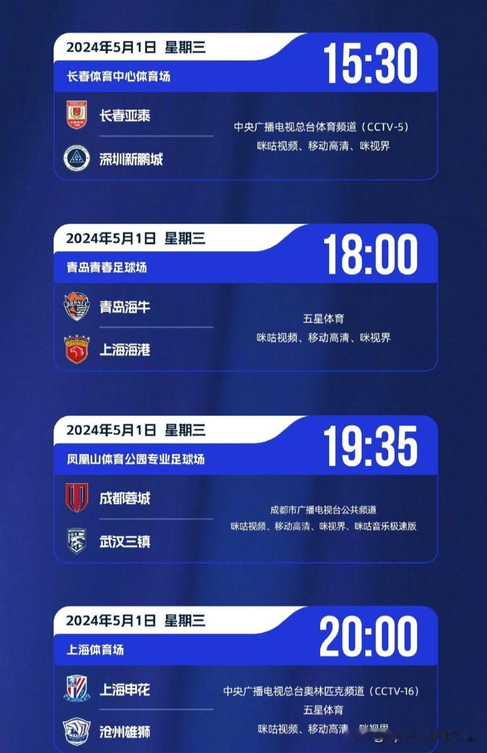 中超联赛5月1日赛程、直播预告,4月30日战报: ⌚15:30 长春亚泰(4分)🆚深圳新鹏城(8分) 🏟️长春体育中心体育场 📹CCTV5/咪咕视频 —————— ⌚18:00 青岛海牛(7分)🆚上海海港(15分) 🏟️青岛青春足球场 📹五星体育/咪咕视频 —————— ⌚19:35 成都蓉城(18分)🆚武汉三镇(8分) 🏟️凤凰山体育公园专业足球场 📹成都市广播电视台公共频道/咪咕视频 —————— ⌚20:00 上海申花(20分)🆚沧州雄狮(13分) 🏟️上海体育场 📹CCTV16/五星体育/咪咕视频 —————— 4月30日战报: 浙江4-1河南 山东泰山3-1南通支云 天津津门虎0-1北京国安 梅州客家1-1青岛西海岸 【图片1 山东泰山3-1南通支云 克雷桑独中三元】