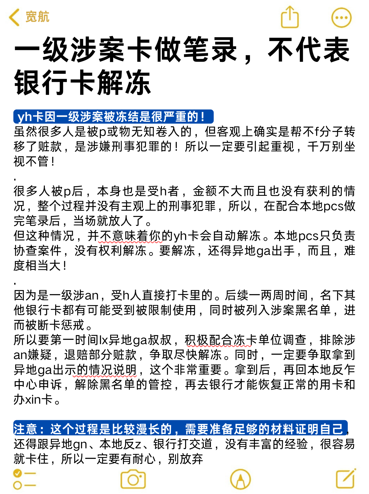 虽然很多人是被p或物无知卷入的,但客观上确实是帮不f分子转移了赃款,是涉嫌刑事犯罪的!所以一定要引起重视,千万别坐视不管!.很多人被p后,本身也是受h者,金额不大而且也没有获利的情况,整个过程并没有主观上的刑事犯罪,所以,在配合本地pcs做完笔录后,当场就放人了。但这种情况,并不意味着你的yh卡会自动解冻。本地pcs只负责协查案件,没有权利解冻。要解冻,还得异地ga出手,而且,难度相当大!.因为是一级涉an,受h人直接打卡里的。后续一两周时间,名下其他y行卡都有可能受到被限制使用,同时被列入涉案黑名单,进而被断卡惩戒。所以要第一时间lx异地ga叔叔,积极配合冻卡单位调查,排除涉an嫌疑,退赔部分赃款,争取尽快解冻。同时,一定要争取拿到异地ga出示的情况说明,这个非常重要。拿到后,再回本地反乍中心申诉,解除黑名单的管控,再去y行才能恢复正常的用卡和办xin卡。ㅤ注意:这个过程是比较漫长的,需要准备足够的材料证明自己,还得跟异地gn、本地反z、y行打交道,没有丰富的经验,很容易就卡住,所以一定要有耐心,别放弃