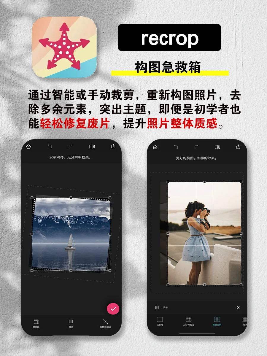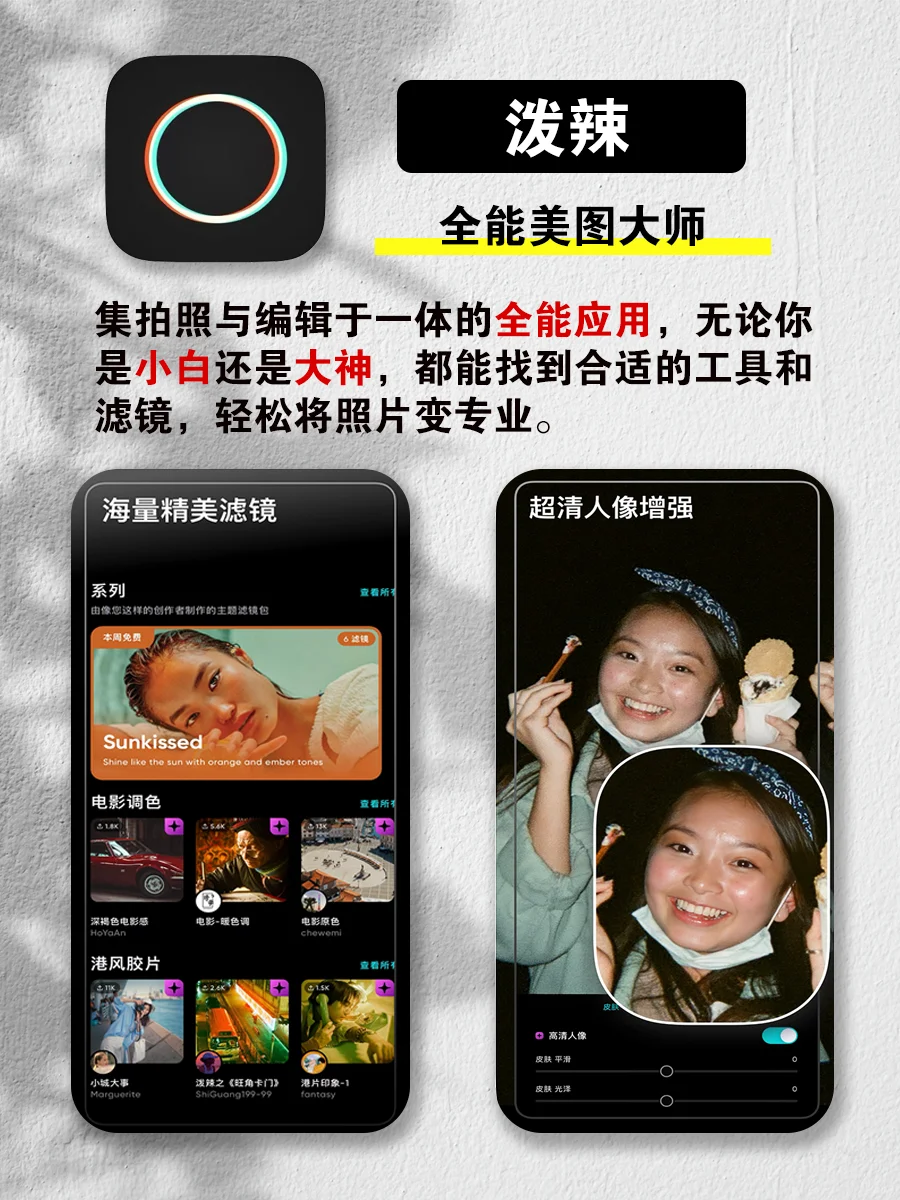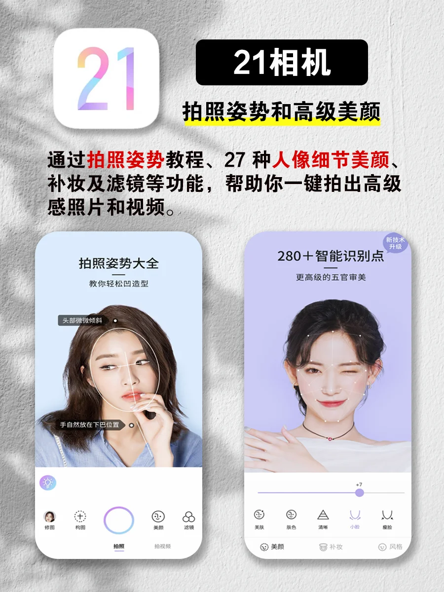📸摄影达人的秘密武器来啦❗ 科仔给大家带来了6️⃣ 款拍照神器!✨ 五一出游,让你成为朋友圈摄影大赛的冠军🏆 不错过每一个精彩瞬间🌆 - 🌟学会构图和姿势,让时间静止在最美一刻✨ 1️⃣21相机 优点:智能识别优化五官,自然妆效提升气色 缺点: 自带构图姿势不够丰富 2️⃣定格相机 优点:同屏拍照,随时随地看到朋友相机里的自己 缺点: 拍照模板需要自定义上传 - 🌟提升拍照质感,每一张照片都像大片一样震撼🎬 3️⃣relens 优点:提供多种镜头模拟效果,手机拍出单反相机feel 缺点: 高级功能可能需要付费 4️⃣咔皮Action 优点:专注于捕捉动态瞬间,多种复古风格滤镜,提供DV录像功能 缺点:在低光环境下可能表现不佳 - 🌟拯救废片,让废片也能变宝物💪 5️⃣recrop 优点:提供智能裁剪功能,能够优化图片构图 缺点:智能裁剪可能不符合个人审美 6️⃣泼辣 优点:拥有丰富的滤镜和调整工具,优化照片效果 缺点:功能繁多可能导致界面复杂,对新手不太友好 -