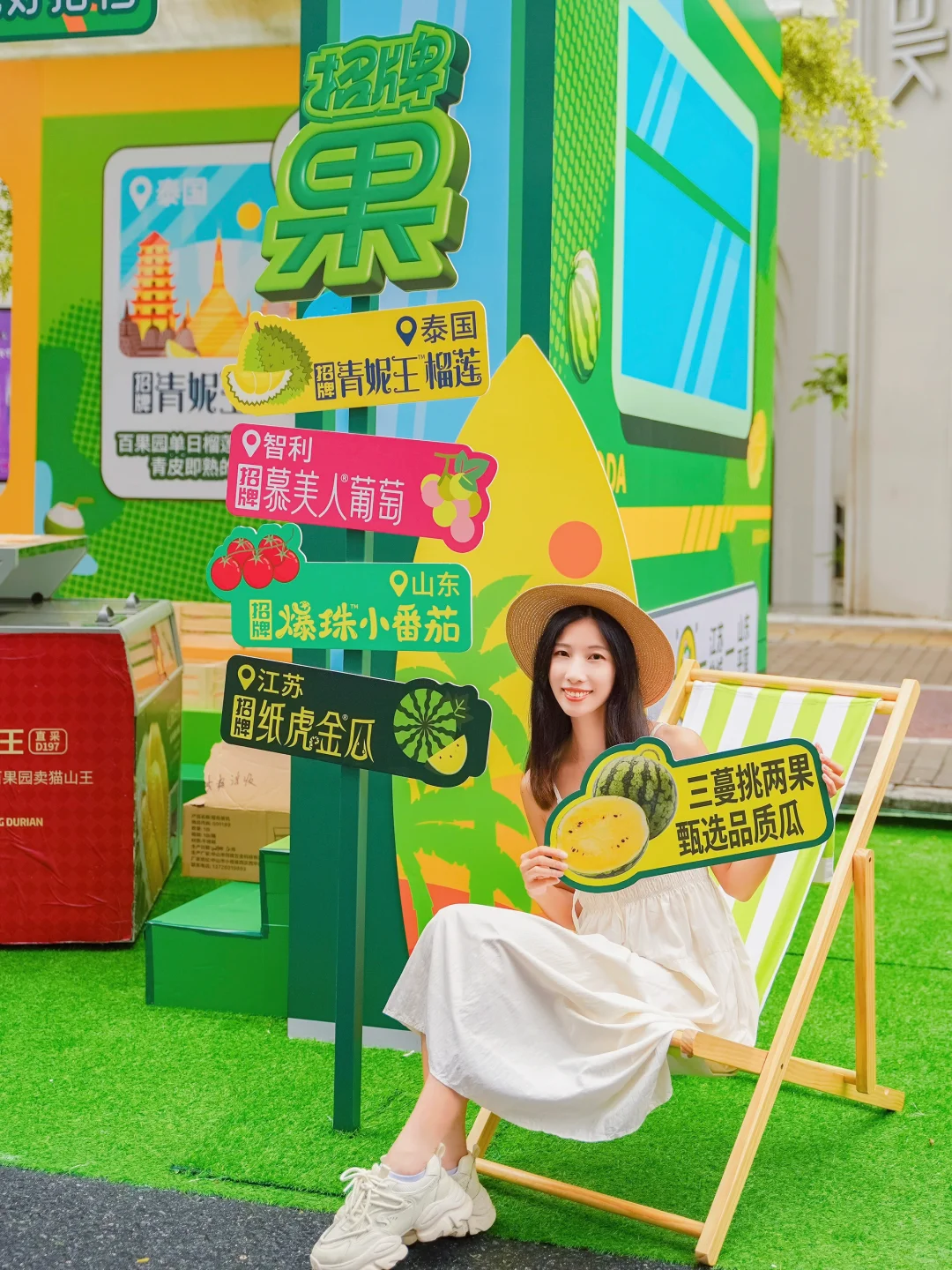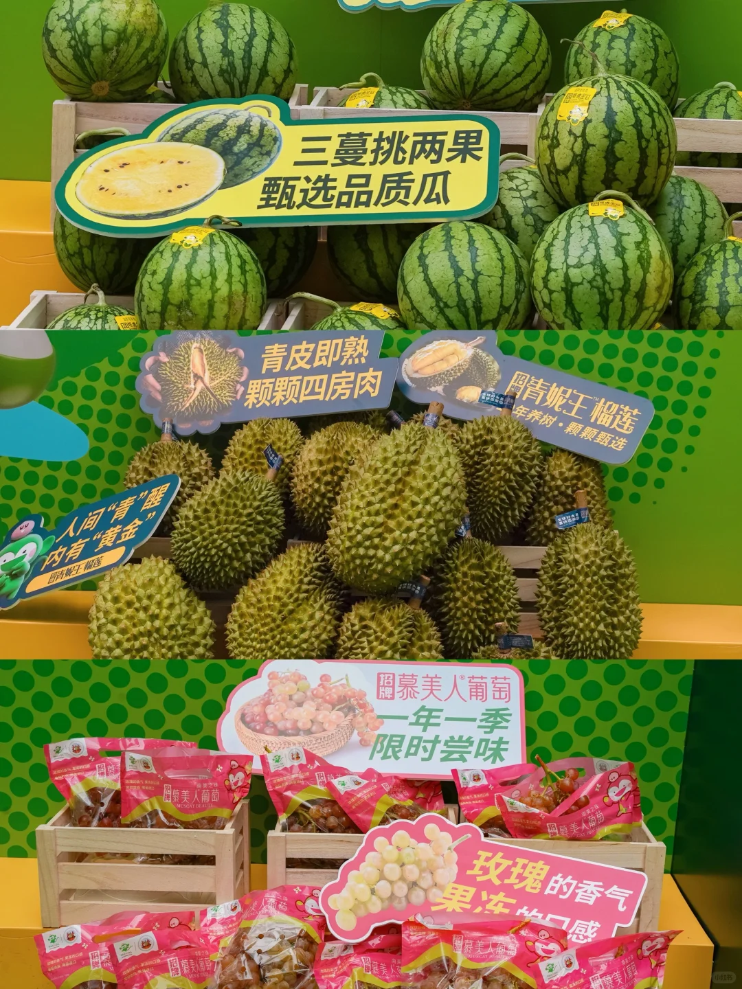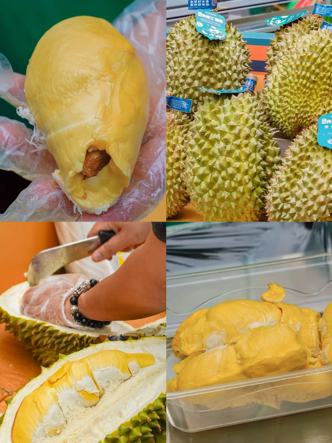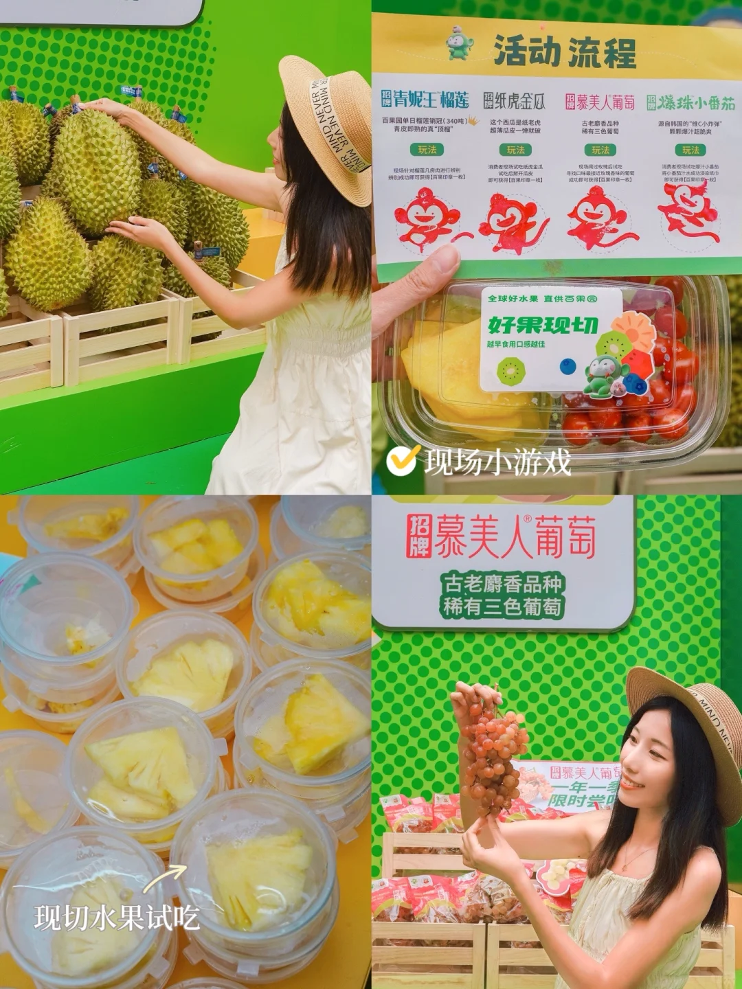 在四海城膨胀面包节游玩,看到百果园可可爱爱的活动摊位,新鲜水果现切现卖,现场还有水果试吃。招牌青妮王榴莲甘甜浓香,肉厚核小,一口去软糯糯的,无敌好吃!还有来自全球各地的招牌果:智利的招牌慕美人葡萄、山东的招牌爆珠小番茄,个小甜度高,江苏的招牌纸虎金瓜皮薄肉甜,泰国的招牌吸个椰子。现场还可以参与互动小游戏领现切水果盒。看到摊位上放着各种当季招牌水果,真的已经期待这个夏天了!💕
