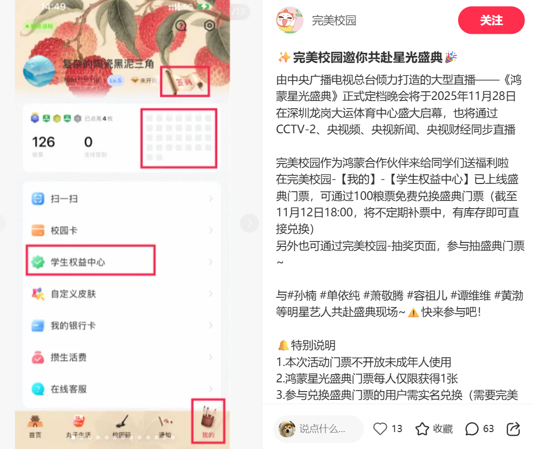 《鸿蒙星光盛典》的热潮不止于此,鸿蒙的“朋友圈”正从四面八方汇聚而来,共同为盛典造势。线上有芒果TV在社交平台发起互动活动,大学生们常用的校园应用里,则有完美校园、学习通、今日校园、超级课程表、到梦空间一众应用组团助力,用各种贴合学生日常的方式,把盛典的热闹劲儿传到了校园的各个角落。这种全方位、多维度的渗透,让“鸿蒙星光盛典”在学生群体里迅速升温,氛围热闹非常。