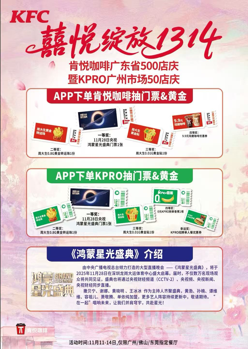 如果说国航代表着“诗和远方”,那么肯德基则带来了“人间烟火”的惊喜。为庆祝广东省500店庆,肯悦咖啡与KPRO(仅限广州/佛山/东莞指定餐厅)开启“喜悦绽放1314”活动,用户通过肯德基App下单肯悦咖啡或KPRO,即有机会抽中一等奖——鸿蒙星光盛典门票1张。但是本次惊喜仅剩11月14日最后一天啦,想要获得盛典门票,或者周大生黄金转运珠、黄金豆、餐饮优惠券等奖品的朋友们,抓紧时间去冲吧!