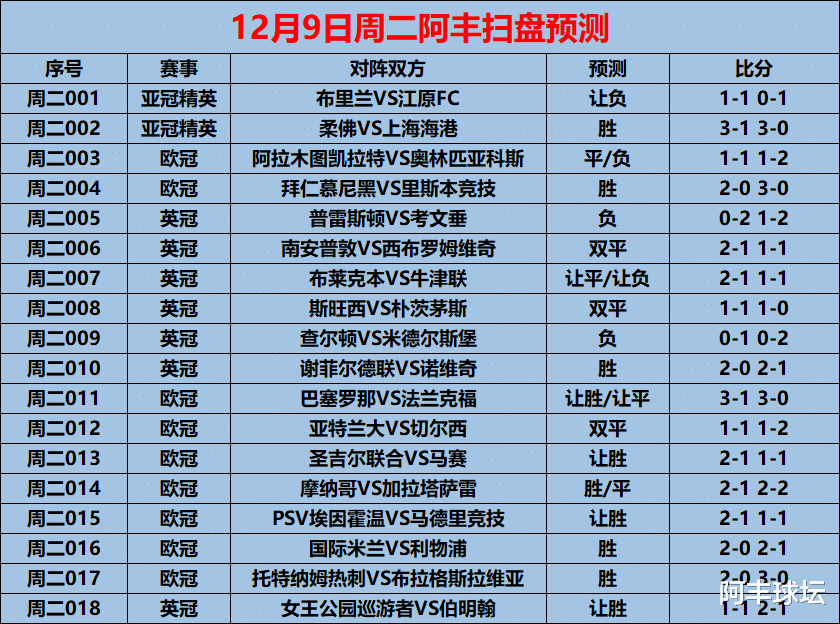 12/9周二赛事前瞻:欧冠 埃因霍温VS马竞(内附18场预测)