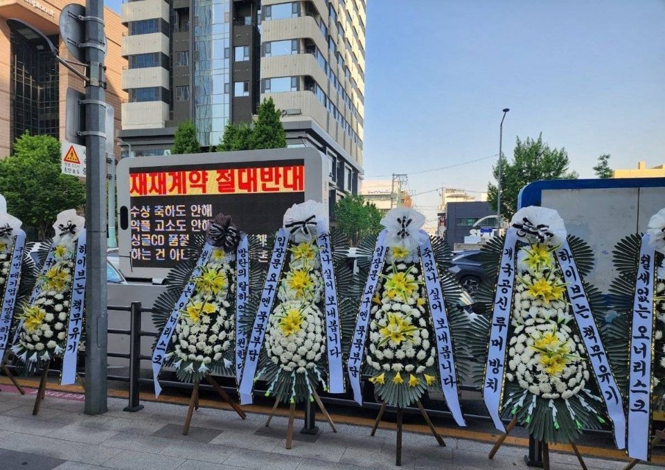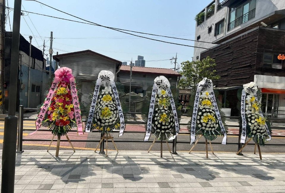 HYBE公司门口被放了大量吊唁的花圈,由粉丝送来
