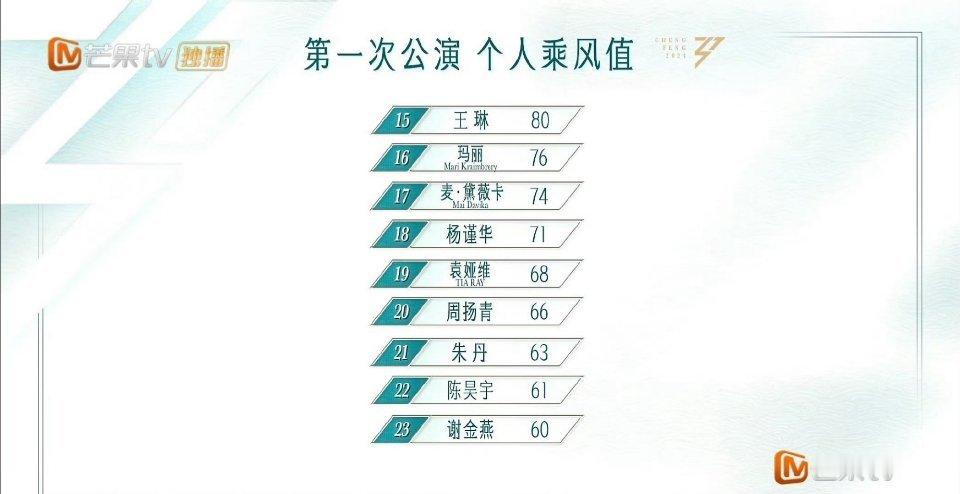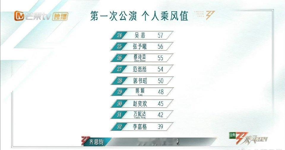 乘风2024第一次公演个人乘风值排名第一名刘忻 第二名陈丽君 第三名戚薇#乘风2