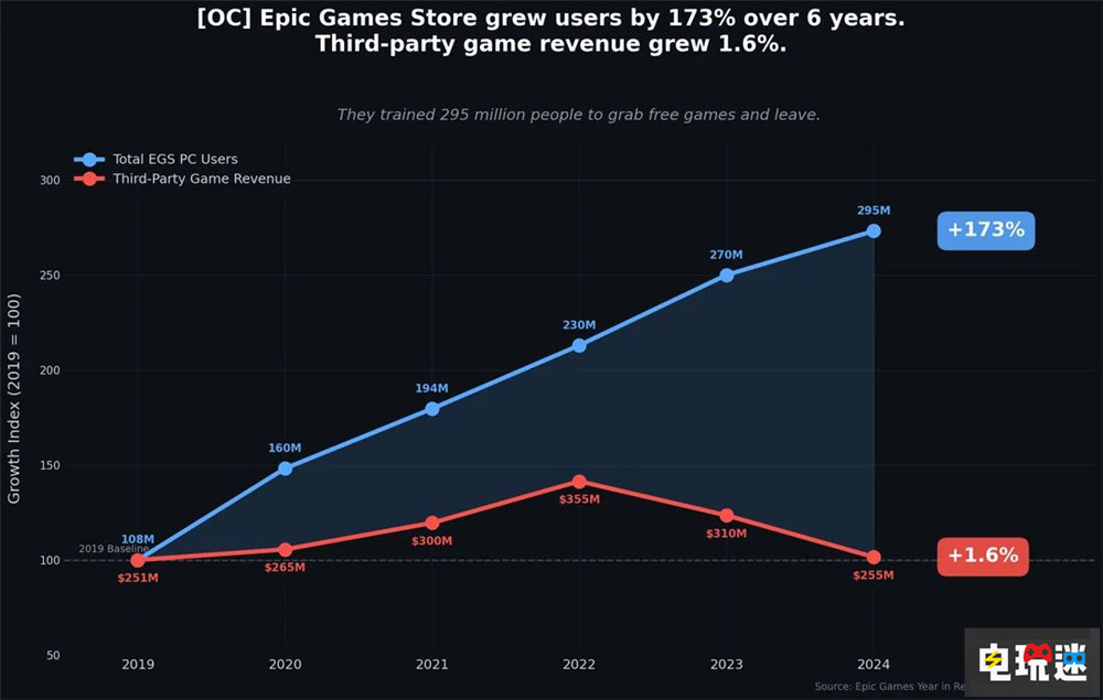 根据Epic官方公开数据,自2019年至2024年这段时间内Epic游戏商店吸引了2.95亿用户。不过实际上大部分用户主要只领取免费游戏,同时游戏营收仅增长1.6%。