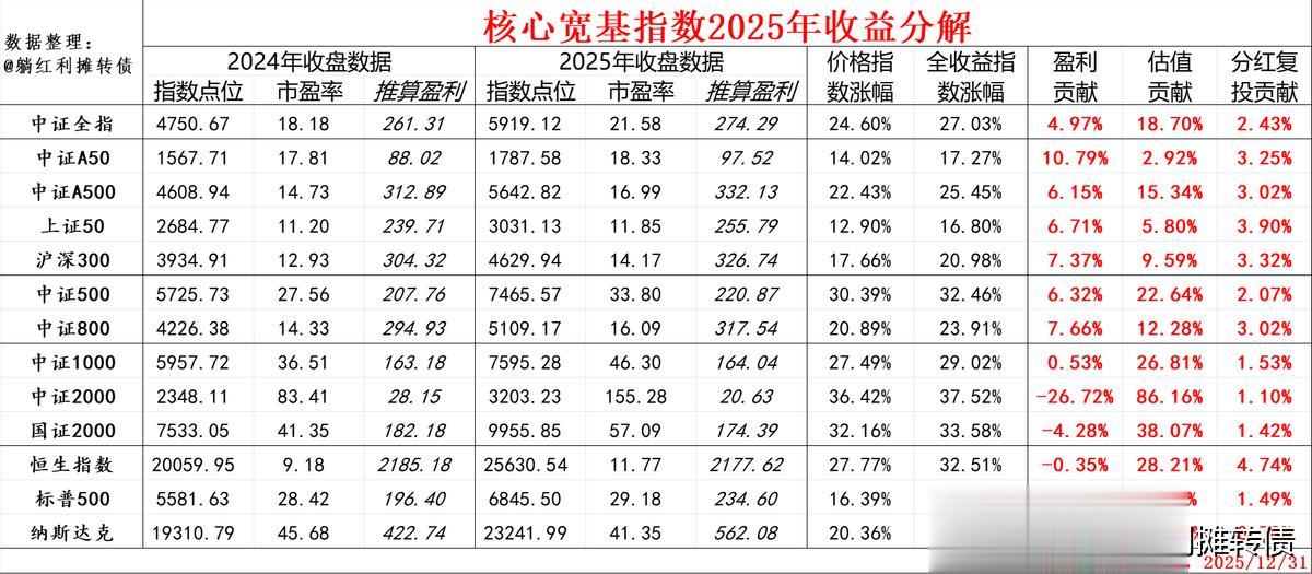 1、如果用中证全指来代表整个市场,则A股在2025年是一个不折不扣的牛市,不过也要注意到中证全指在25年27.03%的总收益中只有大约7.5%的收益属于内在收益(成长+分红),绝大部分收益来自于估值的提升(市盈率从18.18倍提升至21.58倍,提升幅度为18.70%)。