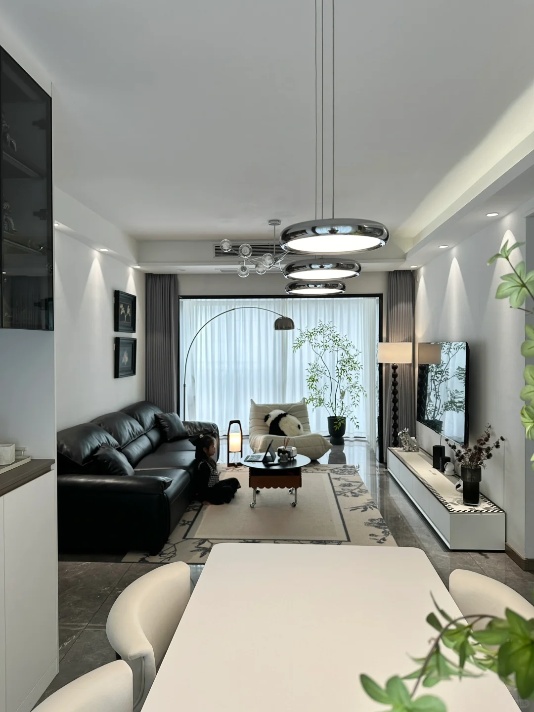 交房的时候啥都没有~ 一字楼边户~南北对流户型 90平套内四房两厅两卫 和大家分享一下90平套内的精装房显大的秘密👇 客厅推拉门拆除,阳台客厅通铺 推拉门封阳台,通风又显大,双阳台对流风很舒服 客餐厅一体南北对流 3.6米客厅,沙发放直排的不占地方 不做复杂背景墙,全屋通刷大白墙 3米餐厅做了满墙餐边柜 餐桌是1.6✖️0.8的岩板餐桌 和餐厅的整体风格很搭配~ 小户型多做柜子真的特别实用~ 每个卧室都是满墙大衣柜 白色更显大