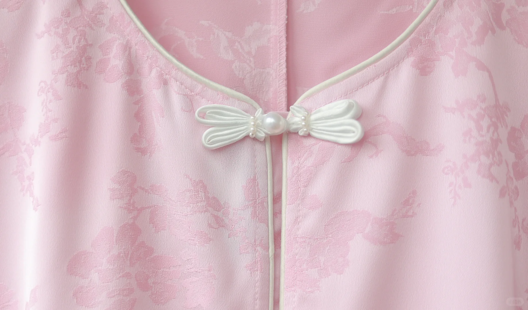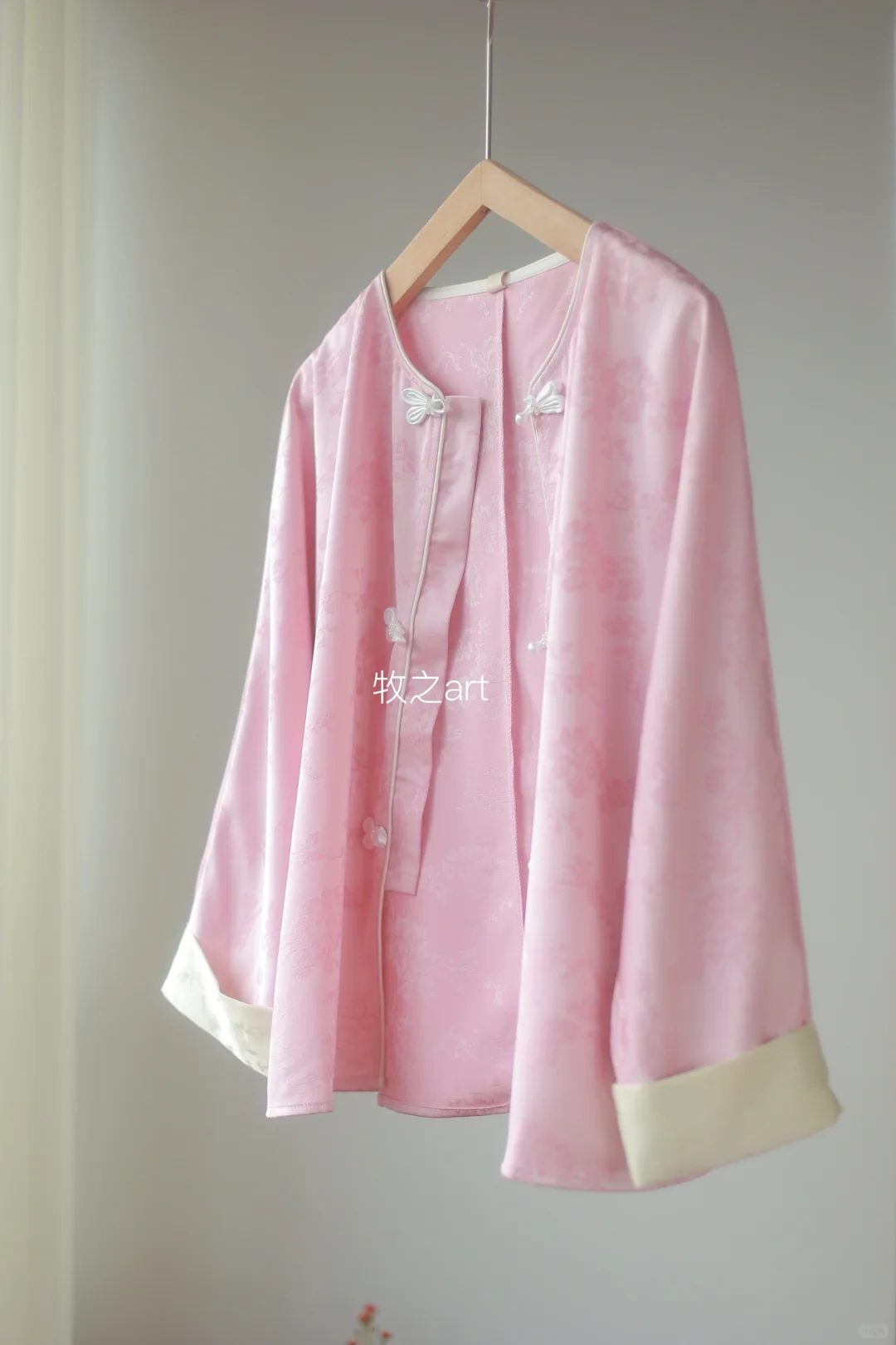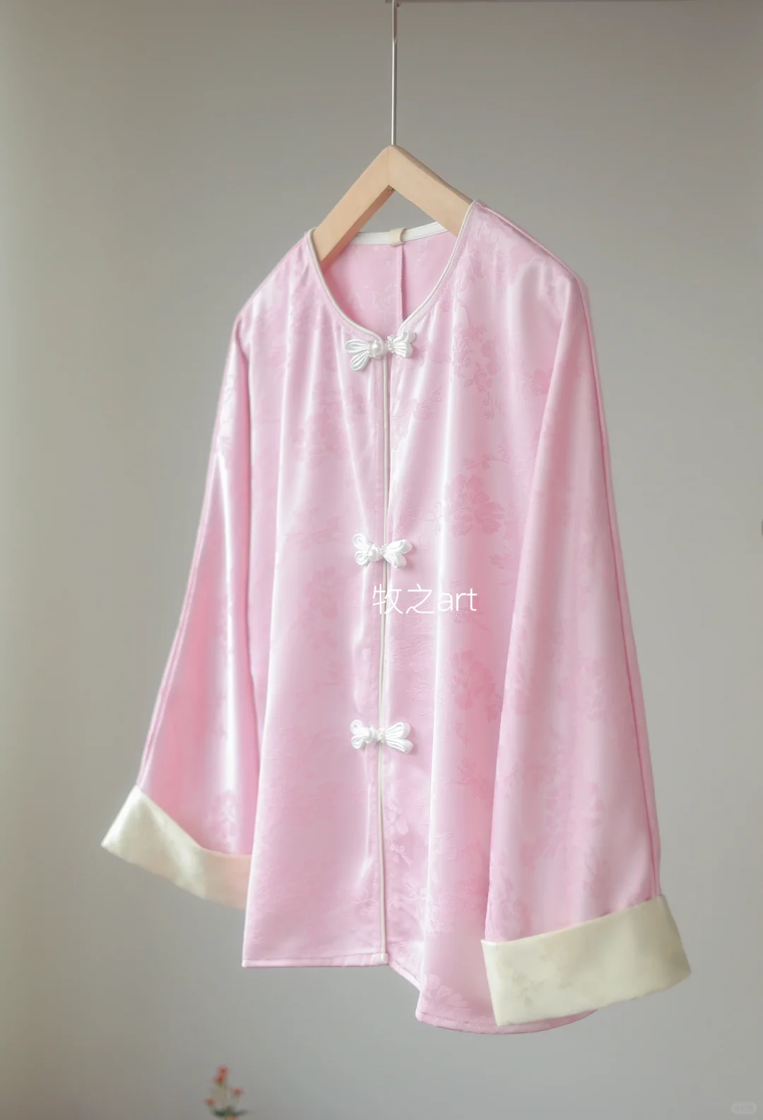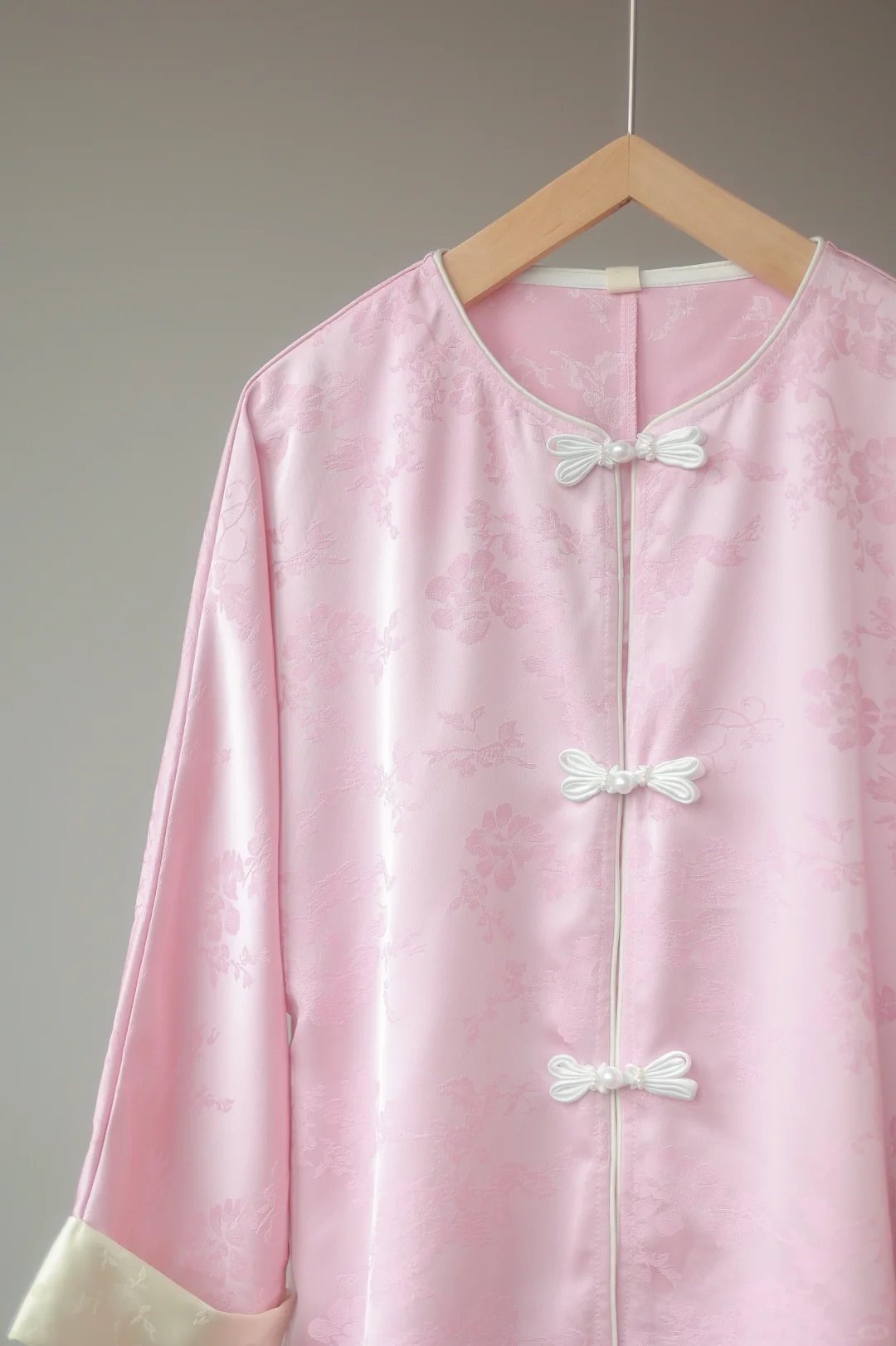 新中式温柔,特别有氛围感 自带光泽,特别气质,在发光~ 给人一种温婉大气的感觉,很贵气 将外套融入日常穿搭就可以,不挑人 这个粉显白配色,搭配蝴蝶盘扣,高级气质 -