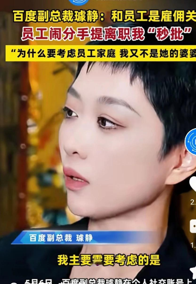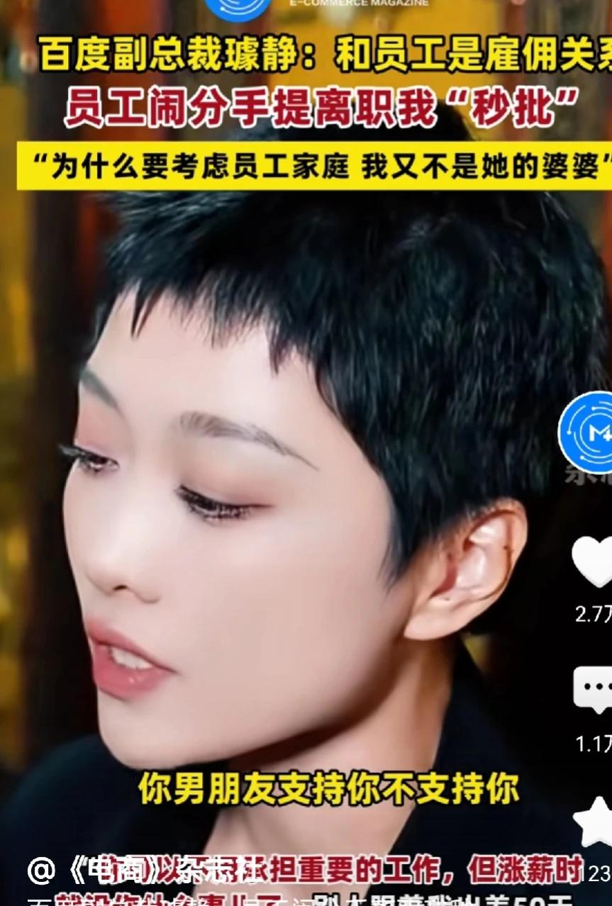 百度副总裁视频引争议,员工不是无情的工作机器,也需要人间烟火气。 近日百度副总裁璩静发了一条视频,引起了争议。大概意思是没必要考虑员工的家庭,员工闹分手提离职我秒批,为什么要考虑员工的家庭,我又不是她的婆婆。她甚至以忘记孩子生日为荣,大肆宣扬自己的奉献精神。 理性评价:说的没有错,但任何一个员工都不会认可。确实是企业招来员工,是为了企业的发展,看中的是给企业带来效益。正如璩总说的,我安排任务,你给我结果就行了,没必要牵扯别的。 但忽视了一点,员工不是无情的工作机器,他也需要人间烟火气。谁都有七情六欲,都会有冰灾伤痛,家里难免也会有点事。当员工碰到困难了,完全不需要考虑? 再者说,我们出来工作是为了什么?大多数人是为了家庭,中国历来的传统就是这样,家在每一个人心中的地位不需多说吧。 大部分人都把对家的这种感情带到了工作中。一个企业给我家的感觉,员工自然努力工作。而璩总这番话却恰恰相反,员工跟企业就是单纯的雇佣关系,你能干就干,不能干,打辞职报告,我秒批。或者纯粹的按照条条框框来办事,难免有点伤打工人的心啊。 大家怎么看呢?