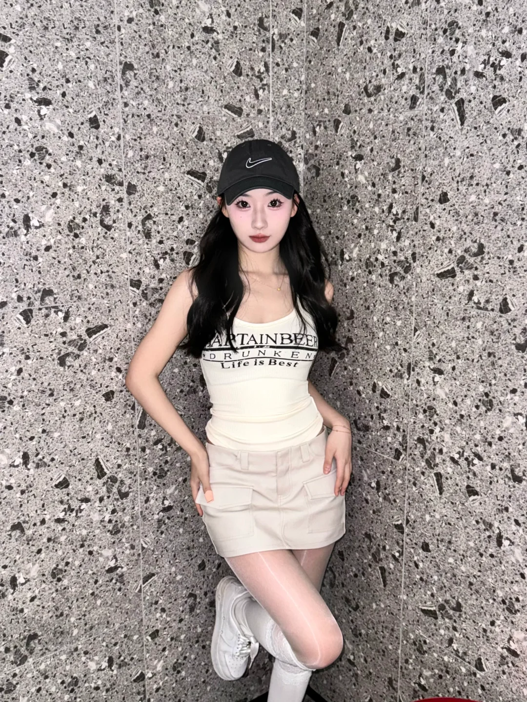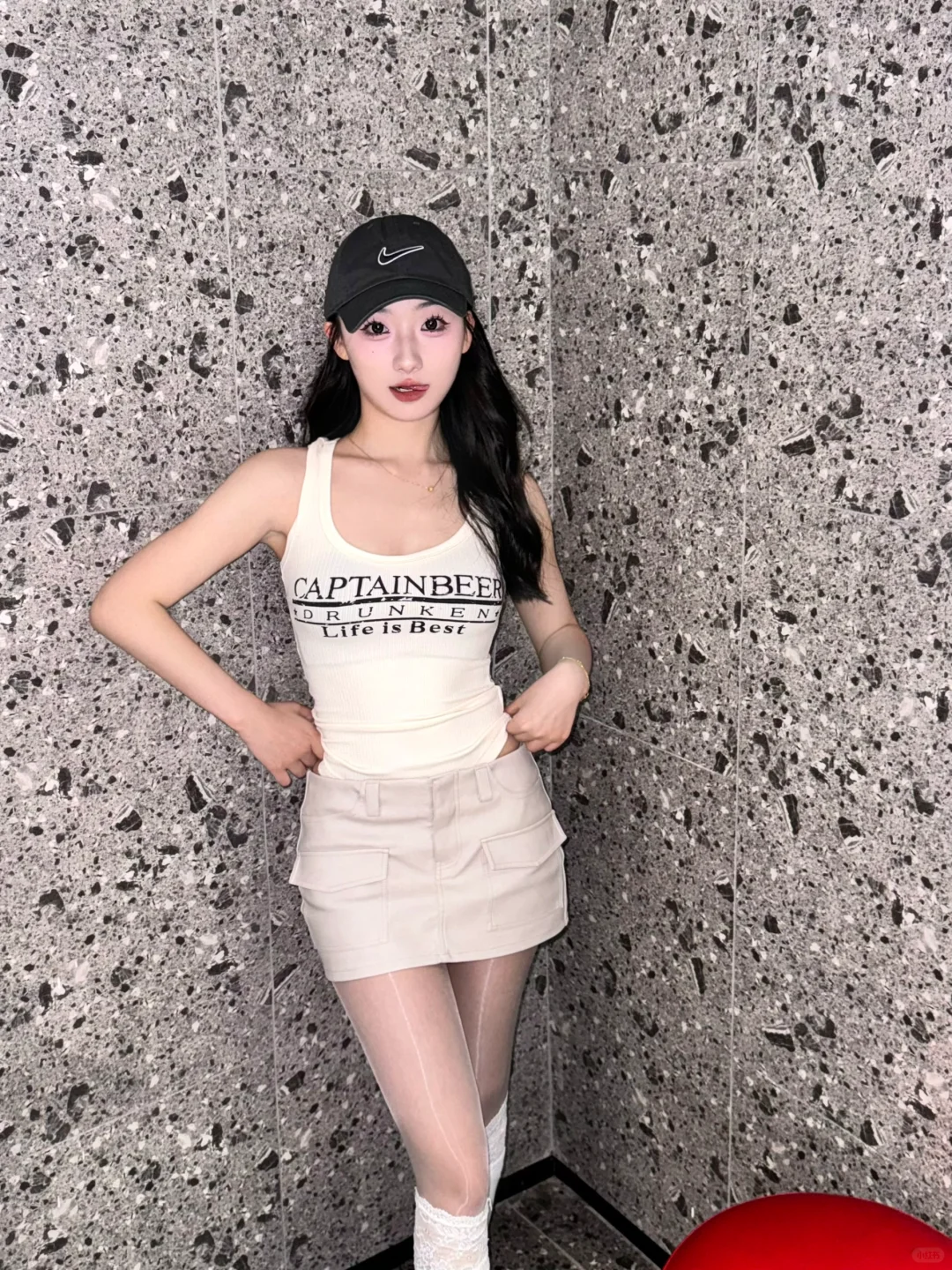 吊带背心+低腰皮短裙 +白色小腿袜 还挺运动挺纯欲的哈哈哈哈