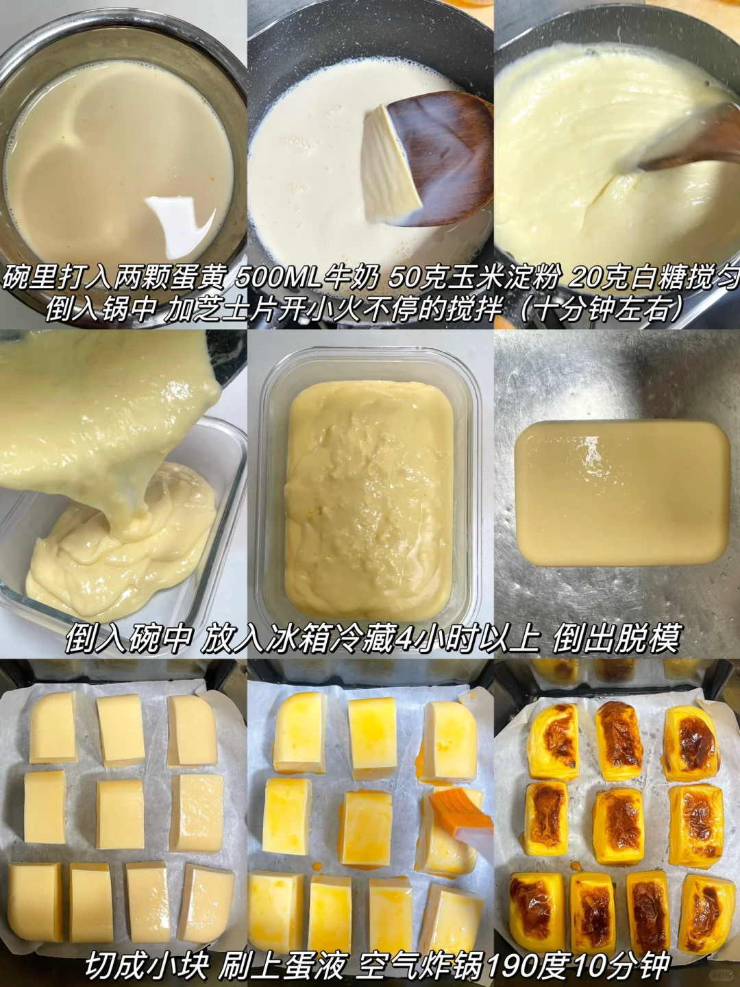 空气炸锅烤牛奶!!真的太绝啦 外面焦香入口嫩滑 奶味贼浓郁 就像在吃蛋挞芯一样! 食材:2颗蛋黄 牛奶500ml 玉米淀粉50g 白糖20g 芝士片 步骤如图⬆️赶紧去试试!!