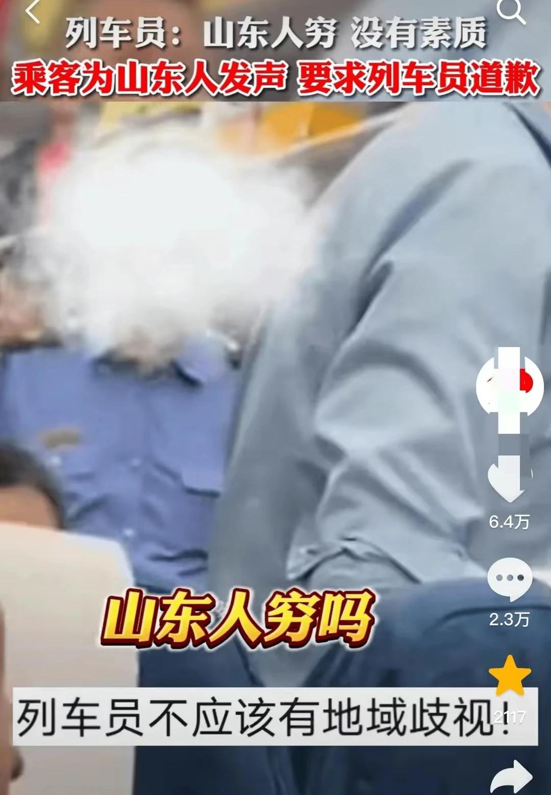 非引战,只是不吐不快!山东人穷,山东人没素质是怎么来的?有这样一个设想,大家看看对不对吧: 列车员觉得山东人穷,肯定不是因为山东人口多,虽然经济全国第三。他是觉得绿皮火车里山东人很多,不坐高铁坐绿皮车是因为山东人穷。 再就是山东人没有素质,穷人就没有素质,这是他的潜在意识。归根结底还是自己工作好,生活优越,觉得山东人土不拉叽的,火车都只坐绿皮车,所以就是穷,穷就没素质。。。 山东人的特点应该是全国皆知的,豪情仗义,本性直爽,直来直去。这样的特点决定了山东人很低调,很淳朴,各地有难,山东总是第一个前往救援,粮食大省,蔬菜大省,给全国提供了多少粮油米面。这些东西是黄土地里长出来的,山东人的很多农民确实有点土,不像有些地方个个是蓝领、白领。但这就代表了山东人穷和没素质吗?谁能离开泥里土里长出来的东西,不食人间烟火的神活着呢? 总结一下:有些人离开土地太久了,已经不知道什么才是最淳朴的感情了。