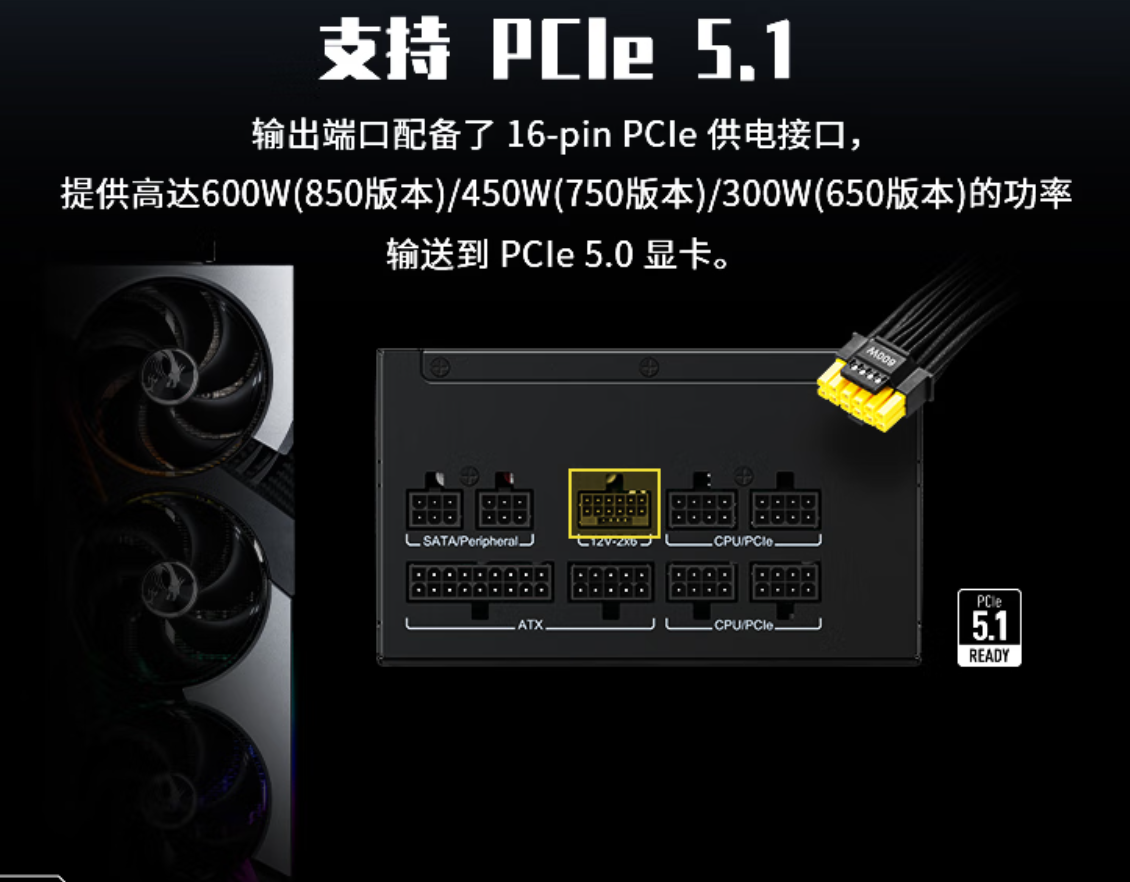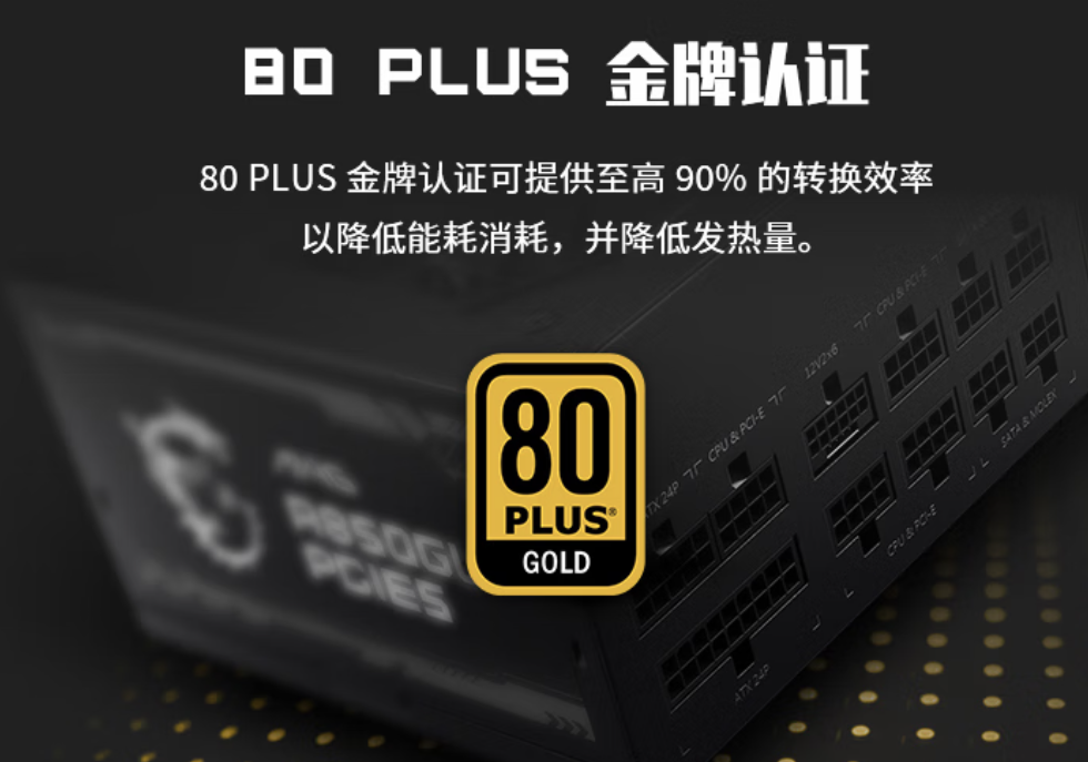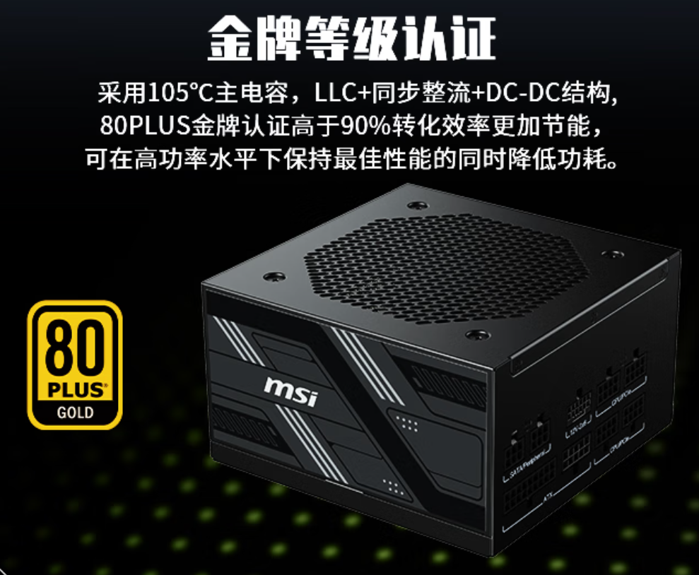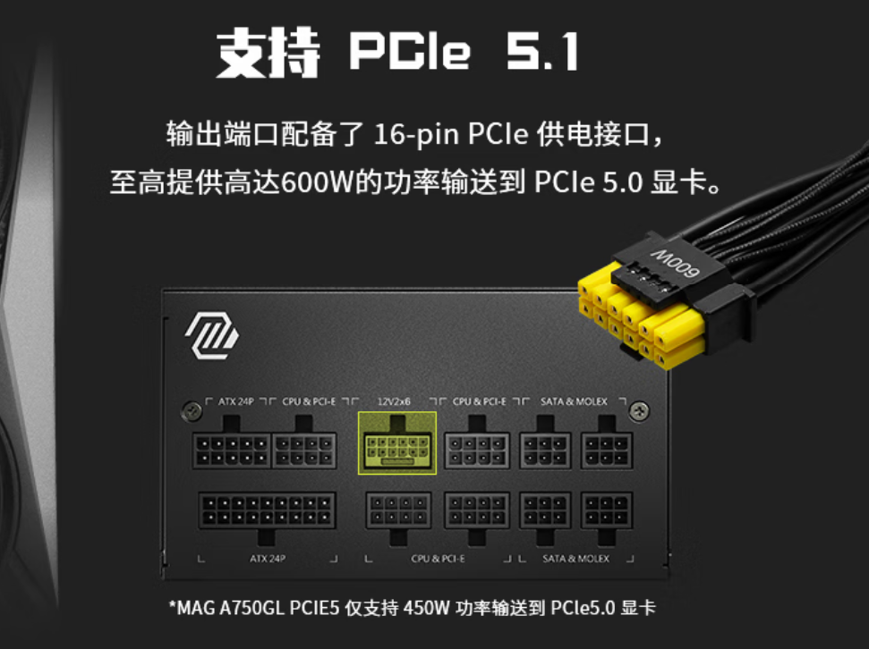 微星 PAG G650LS PCIe5 电源专为新一代高性能平台打造,支持PCIe 5.1标准,原生配备16-pin(12V-2x6)供电接口,可稳定输出高达300W的功率,为PCIe 5.0显卡提供高效且简洁的供电方案。内部采用LLC + 同步整流+ DC-DC架构,搭配105°C 日系主电容,通过80 PLUS金牌认证,转换效率高达90%,在高负载下依旧保持节能与低发热。