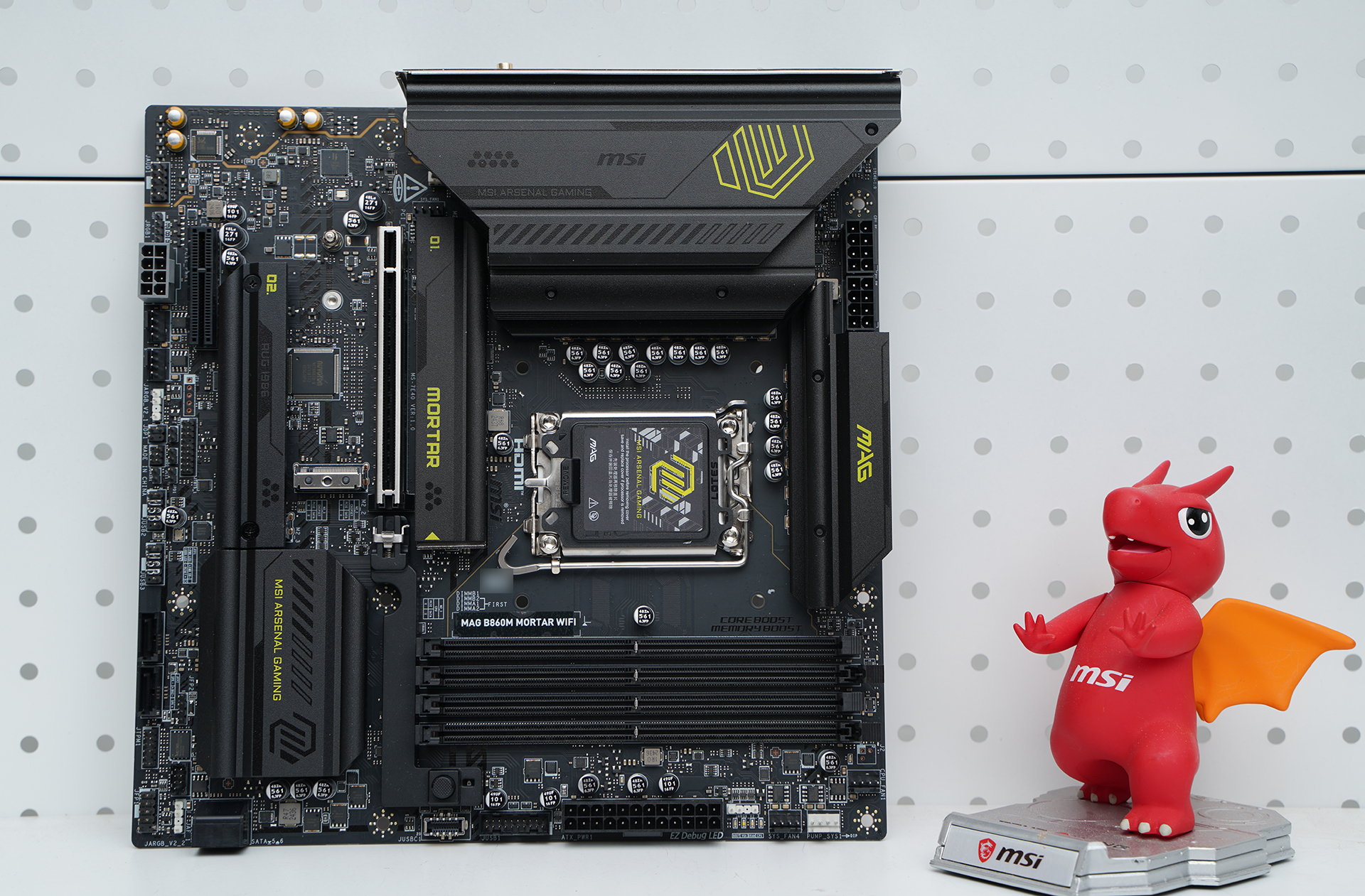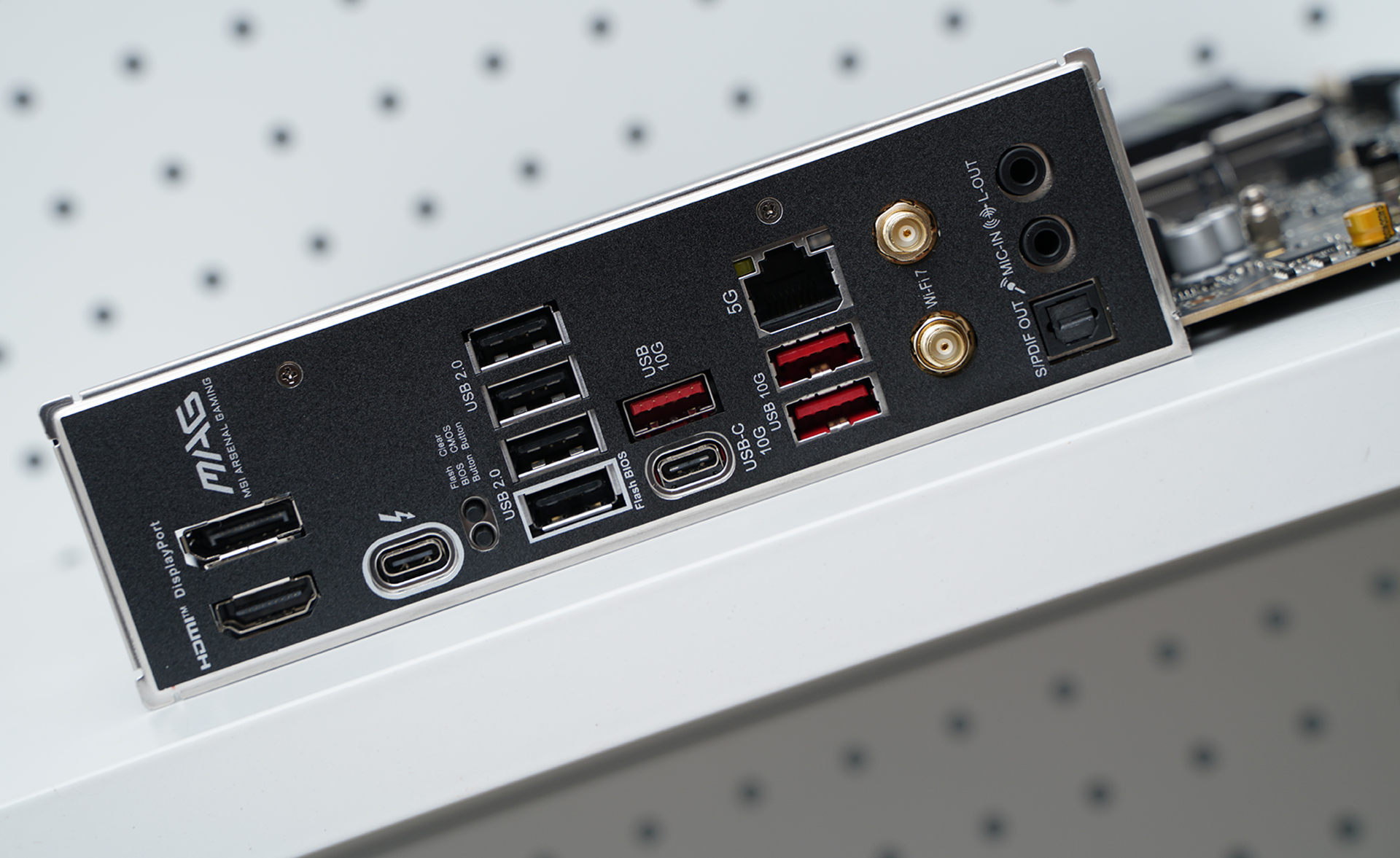 后置 I/O 接口方面,微星 MAG B860M MORTAR WIFI 配置相当齐全:配备 1 个 DisplayPort 1.4 与 1 个 HDMI 2.1 显示输出接口,支持高分辨率多屏输出;同时提供 1 个雷电 4 接口、3 个 USB 10Gbps(Type-C)、3 个 USB 10Gbps(Type-A) 与 4 个 USB 2.0 接口,满足多设备高速连接需求。网络部分内置 Wi-Fi 7 无线模组,传输更快更稳。中间还贴心设计了 Clear CMOS 按钮 与 Flash BIOS 快捷键,方便玩家快速调试与更新BIOS。