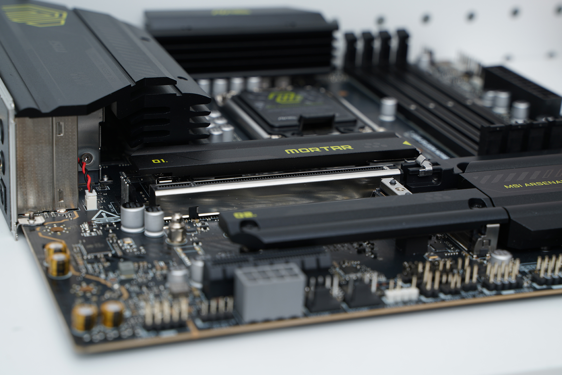 在内存插槽方面,新一代处理器平台由于摒弃了DDR4内存控制器,纯支持DDR5内存,起步支持频率就已经达到6400MT/s,同时凭借支持CUDIMM内存,集成CKD,有效解决了CPU与DRAM之间的时钟信号传输瓶颈,使得内存能够在更高频率下稳定运行,同时增强了系统的整体稳定性。这也使得微星Z890刀锋钛主板有着支持OC 9200MT/s内存频率的底气,最高支持256GB双通道。