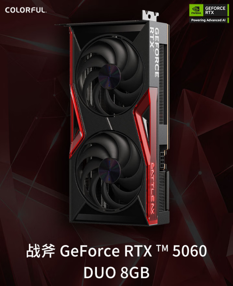 七彩虹 战斧 GeForce RTX 5060 DUO 延续了系列一贯的硬朗设计,采用全新 环型风扇 系统,配合双滚珠轴承结构,兼具高风压与长寿命特性,并支持 智能启停,在低负载时静音运行。外观上融入 战斧 RGB 光效,能量晶体造型点燃战斗氛围。整卡散热器结构紧凑而高效,既坚固耐用又易于装机,非常适合追求性能与实用兼顾的主流玩家。