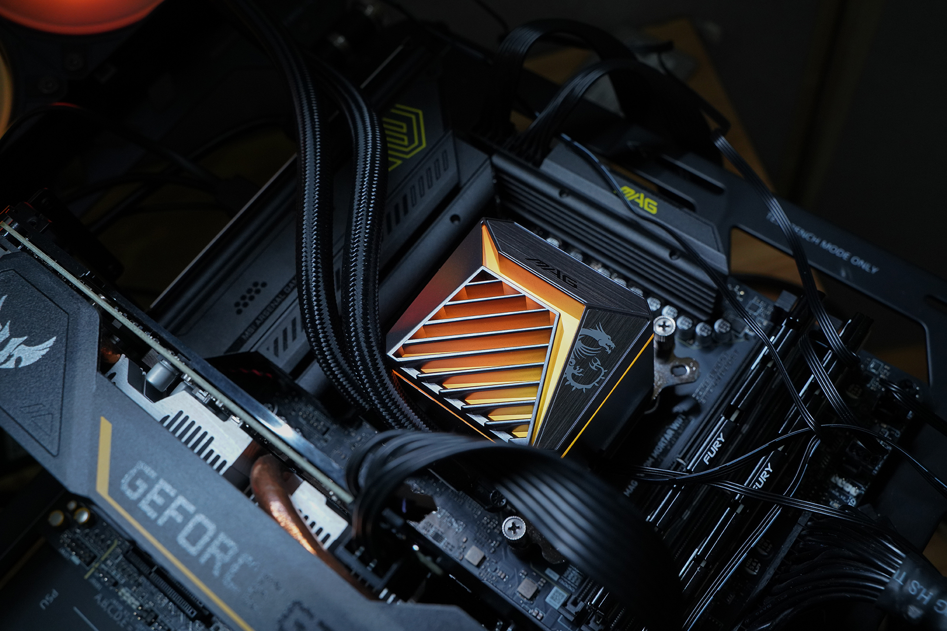 不得不说这金属铠甲的颜值是真的帅,而且面积很大,完全覆盖掉4路M.2固态硬盘。