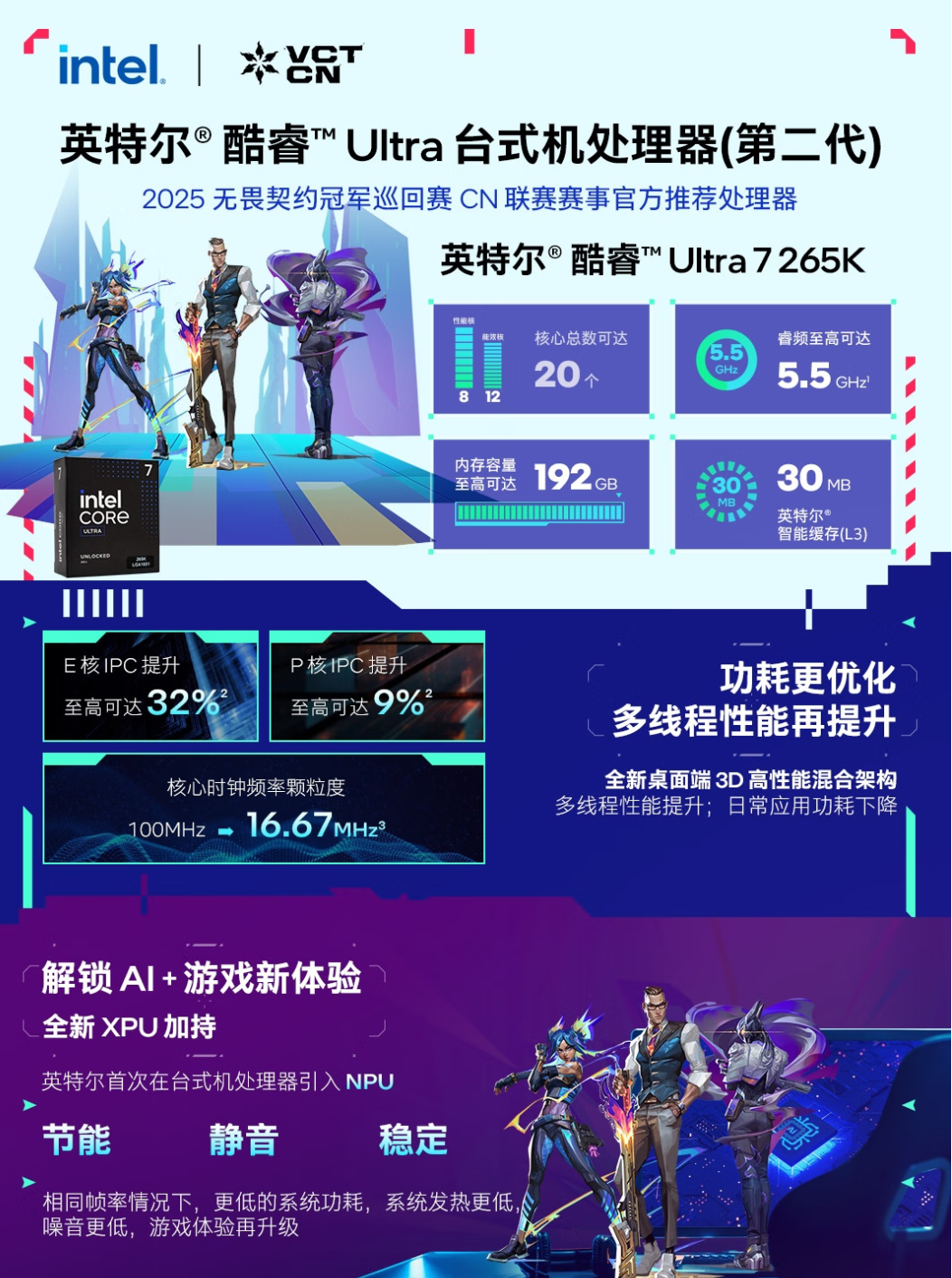 先来看处理器部分——作为整机的灵魂,它的定位始终至关重要。这里选用的 英特尔酷睿 Ultra 7 265K,基于全新的 Arrow Lake 架构,以更彻底的设计革新重塑性能格局。本代虽取消超线程,但通过 8 个性能核 + 12 个能效核 的 20 核组合,展现出更高效的并行处理能力。得益于 台积电 N3B 先进制程 与强化后的能效核心,它在多线程创作与高负载场景中依然稳健强悍,同时兼顾更低发热与能耗,真正实现性能与能效的平衡,预示桌面处理器迈入新世代。