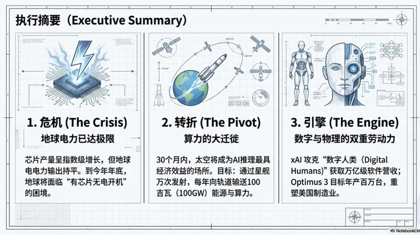马斯克认为,受地球电力瓶颈限制,3年内太空将成为AI推理最具经济效益的场所,描述通过Starship万次发射构建太空算力、通过xAI解锁数字人类、量产人形机器人Optimus,带来无限能力与财富的未来图景。