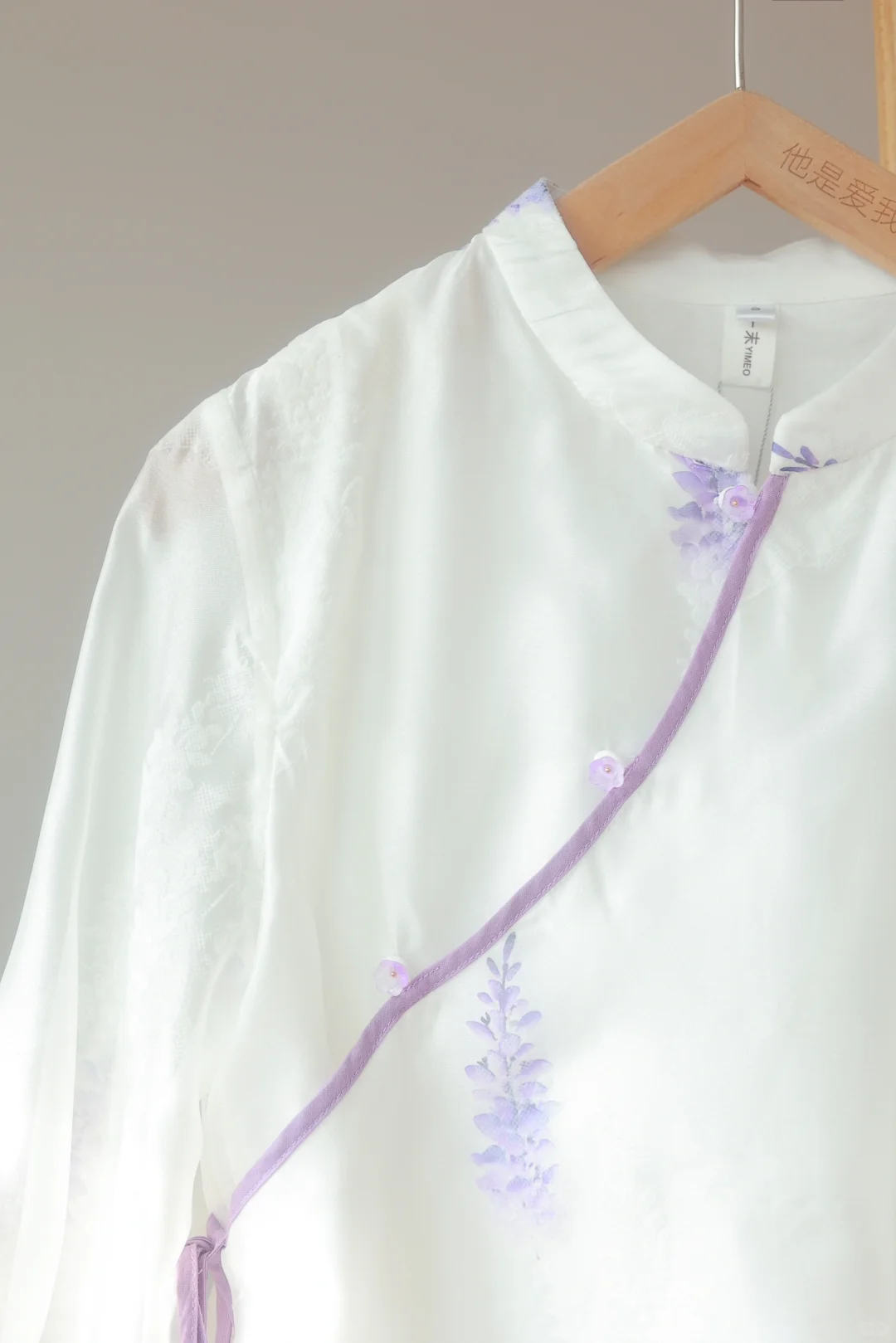 xiexie 2024-06-11 18:15 衣服没有色差,花瓣扣很可爱。衣服的名字:少女心事,很贴切,穿上以后感觉自己回到了少女时代。衣服颜色搭配很妙,珠光白+紫色衣边+粉色花瓣扣,真的太美好了。158,50kg,S码合适。