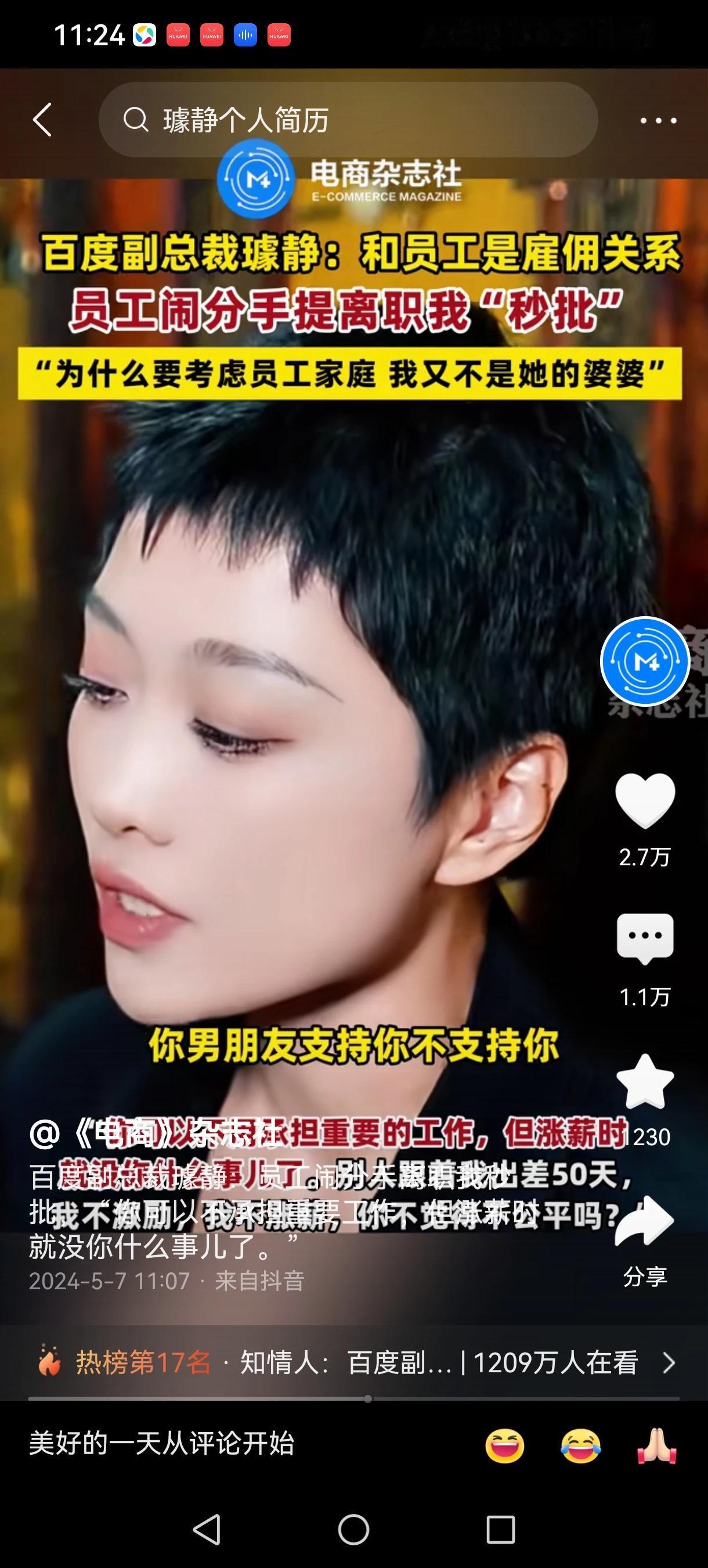 璩静离职了,百度又火起来了,这也是公关的一种套路吗? 在她慷慨激昂的宣扬自己的狼性企业文化时,忘了自己也只是一名打工人,自己并不能代表百度。 她的言论可谓一石激起千层浪,任何一个企业至少表面上是必须讲究人文关怀的。璩静错在把这事说透了。只干不说的原则没有把握好。据报道,百度创始人李彦宏与人力资源负责人崔珊珊召开小范围员工沟通会,对璩静事件进行了点评。据获悉,李彦宏现场表彰了百度优秀员工,“你们才代表百度,你们才代表最真实的百度,你们才是百度最真实的代表。”李彦宏情绪颇为激动的表示。 百度人力资源负责人崔珊珊表示,在百度没有什么比“简单可依赖”的价值观更值得守卫和坚守。舆论的喧嚣总会过去,而我们的自我革新永不止步。 事就是这么个事,但有疑点,璩静是公关副总裁,还曾经在华为任职过公关。能力水平绝对是有的,应该知道那一番慷慨激昂的演讲会有什么反响。大家有没有发现,她像是唱白脸的,创始人和人力负责人像是唱红脸的。一反一正操作下来,最终百度又一次出现大众视野之内了。 大家怎么看呢?