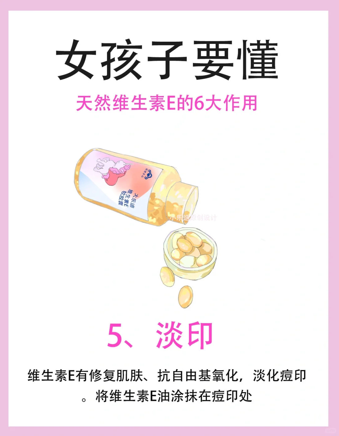 1、保湿 女生皮肤干燥,容易起皮,可以利用维生素E来给皮肤保湿。 2、美白 将珍珠粉、蛋清、维生素E搅拌均匀地敷在脸上,约15分钟后清洗干净。 3、祛斑 将维生素E涂抹在长斑的部位,坚持下来会看到明显的变化 4、润滑 维生素e搭配身体乳,保湿润滑的效果杠杠的 5、淡印 维生素E有修复肌肤、抗自由基氧化,淡化痘印。将维生素E油涂抹在痘印处 6、清洁 将维生素E、酸奶、蜂蜜一起搅拌均匀,直接敷脸10分钟,主要作用是清洁肌肤、清理毛孔