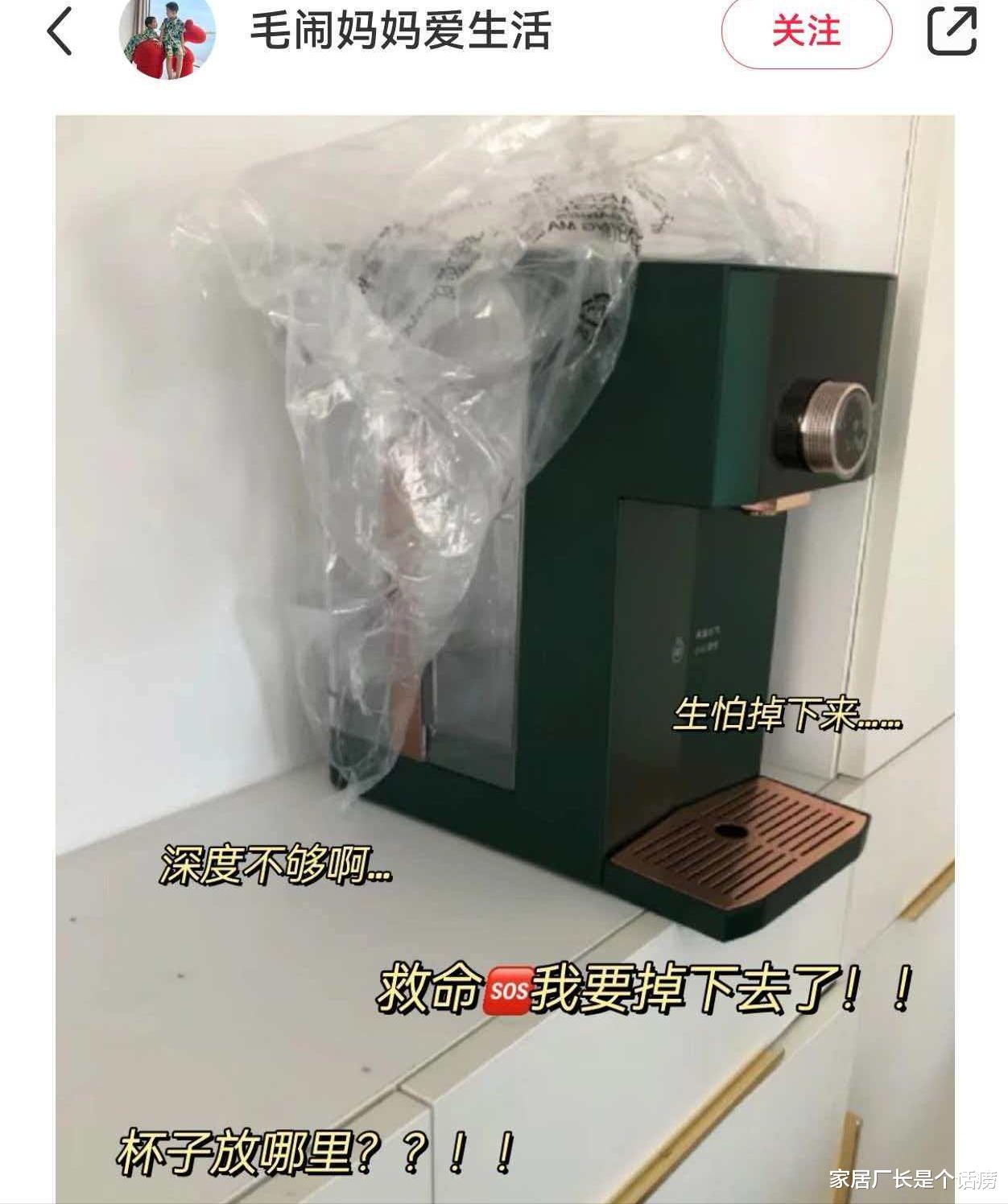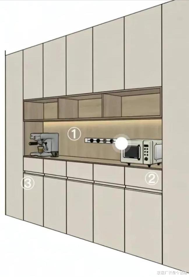 深度一定要提前算好,把想放的烧水壶、电饭煲、咖啡机这些小家电的尺寸都量一遍,深度不够的话,小家电会突出柜体,使用受影响,强迫症看了直呼难受,视觉上膈应。