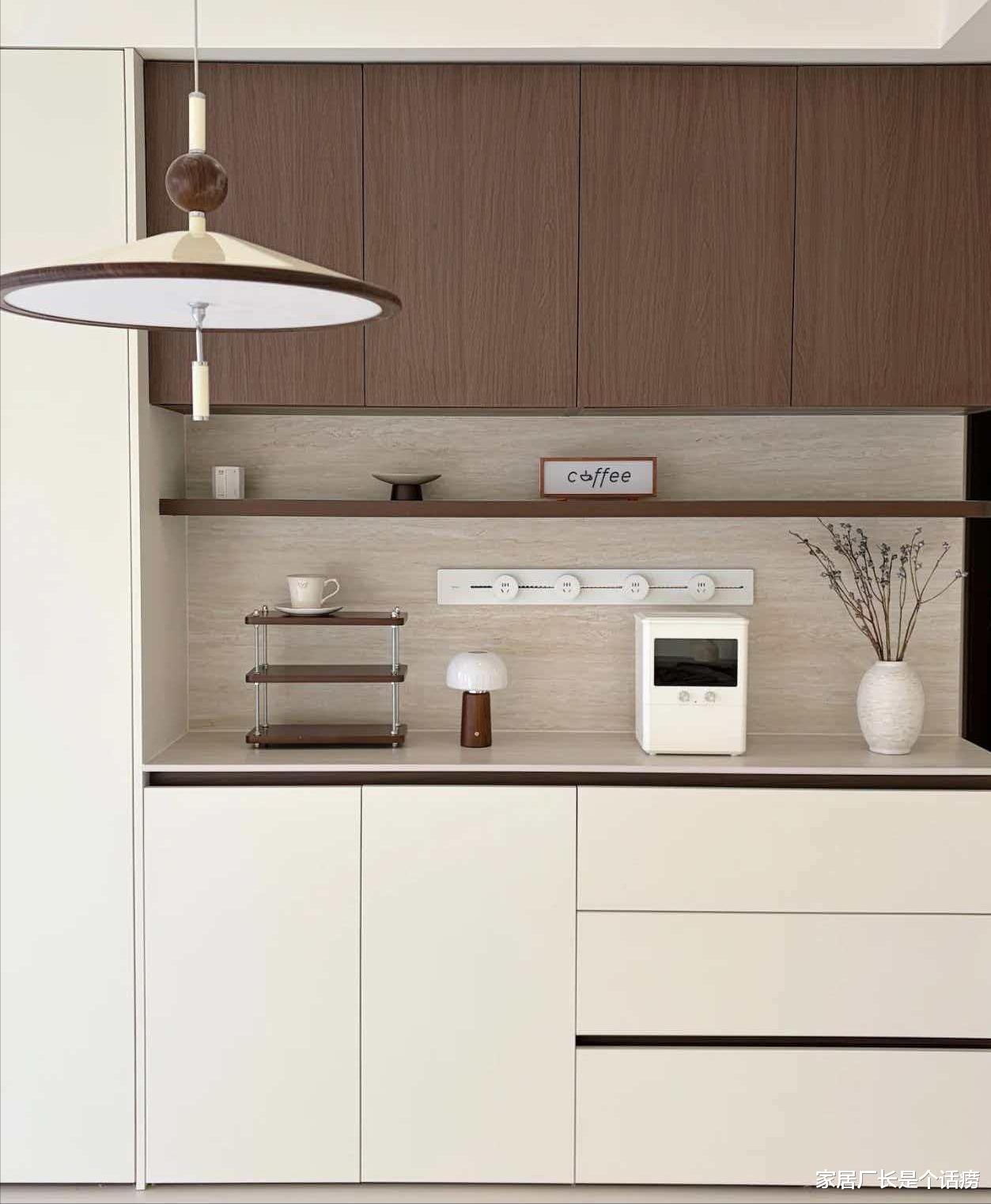 吊柜内缩:如果餐边柜的深度足够,把吊柜往内缩一点,不仅能避免站在操作台旁备餐时碰头,还能让柜子显得错落有致,立体感拉满;