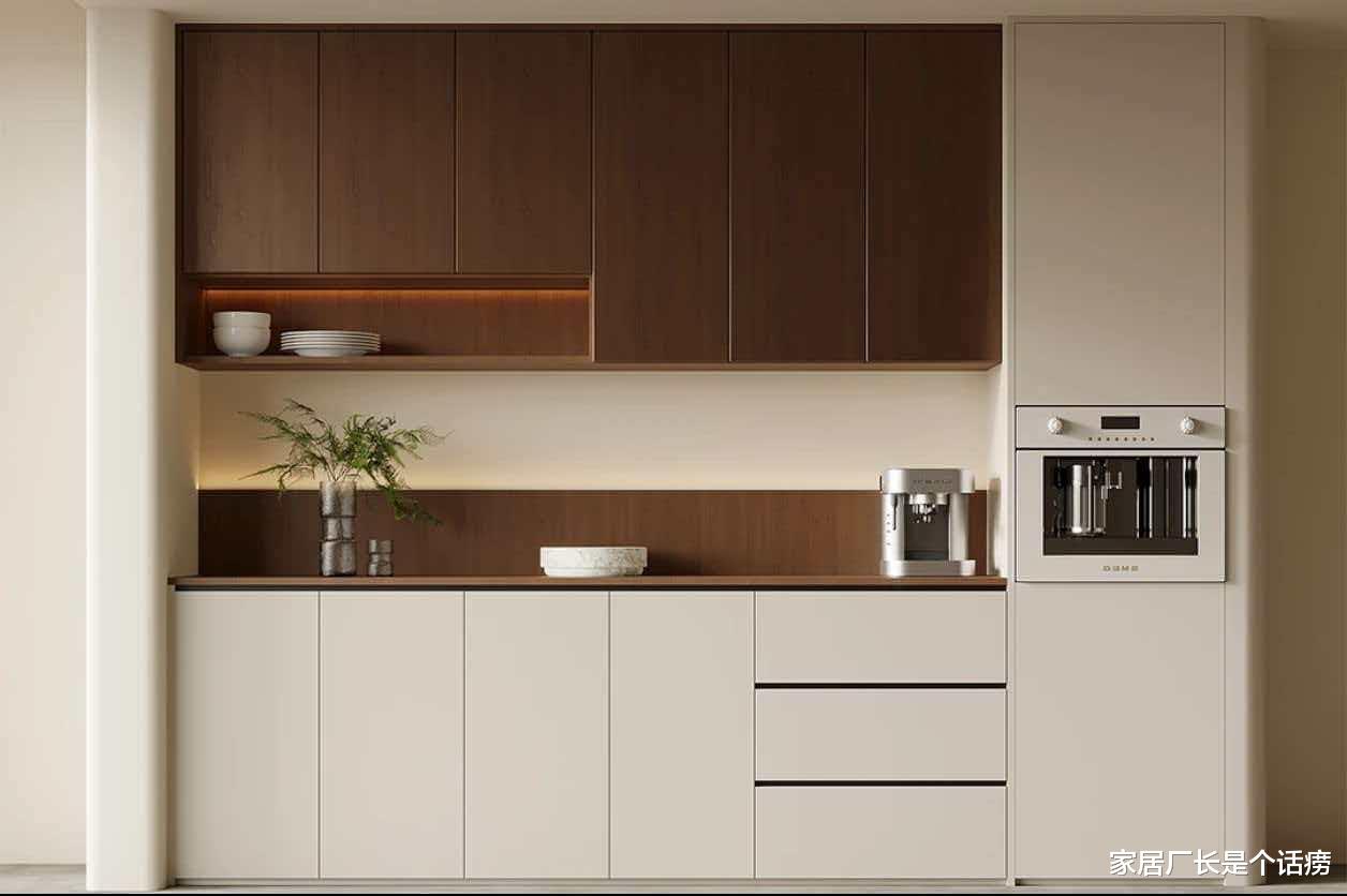 给操作台或者吊柜做和主体柜体不一样的拼色,不用太鲜艳,黑白灰棕之间的搭配就足够,瞬间就能跳出单调感,颜色差异,是制造高级感最直接的方式之一。