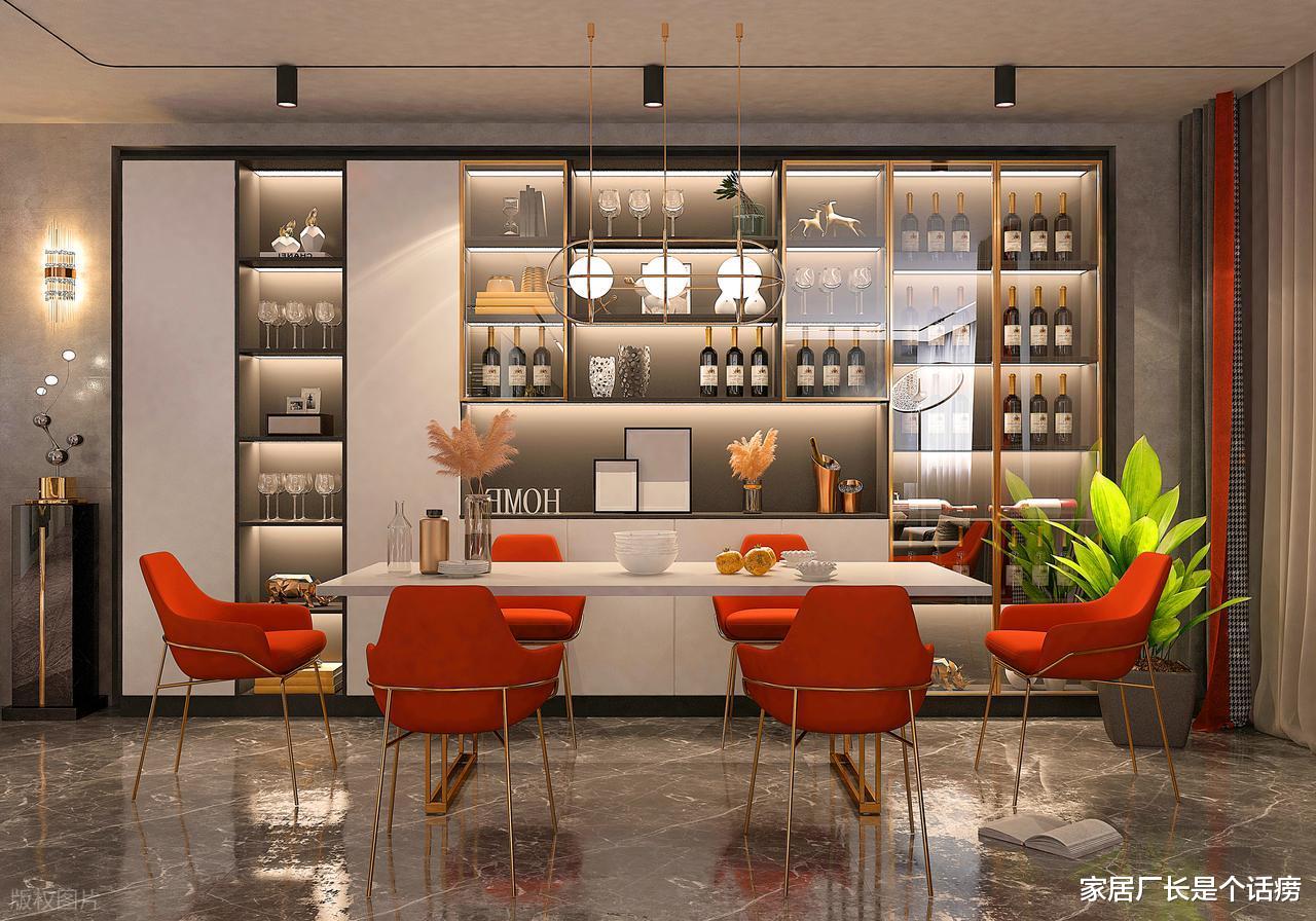 反光、难清理都是小问题,关键是咱们一般很难把玻璃柜里的东西摆得整整齐齐,稍微乱一点,从外面看就乱糟糟的,拉低整个餐厅的质感,实在想做玻璃门酒柜,只留一小块区域就够了。