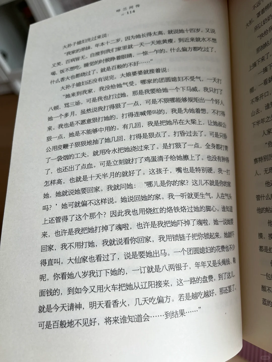 跳大神的老胡家买回来的团圆媳妇,脸长得黑乎乎的,笑呵呵的,梳着很大的、快长到膝间的辫子。被她的婆婆又打又骂又吓,吊在大梁上用鞭子抽,用烧红的烙铁烙脚心,病了。请胡仙、跳大神、喝偏方、抽帖儿、赶鬼烧替身,团圆媳妇还是死了。老胡家在团圆媳妇身上花掉了让他家倾家荡产的五千多吊钱。