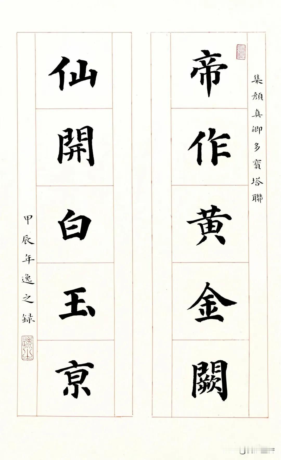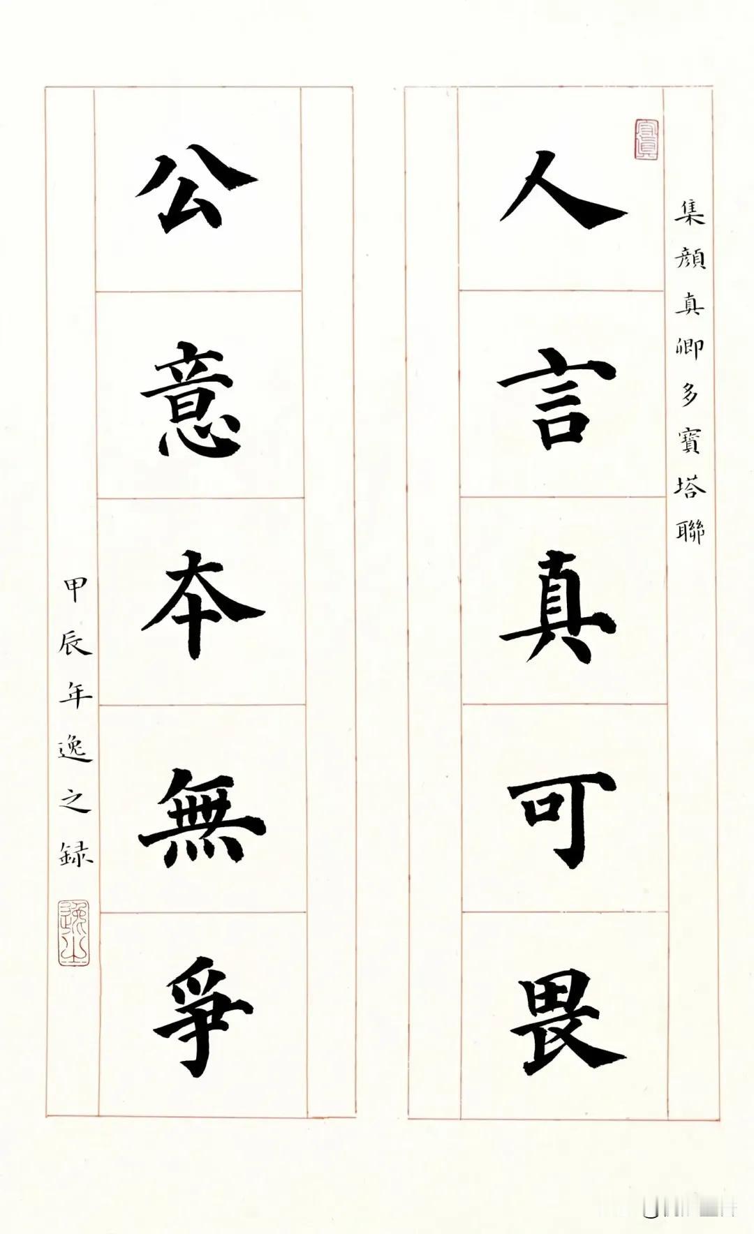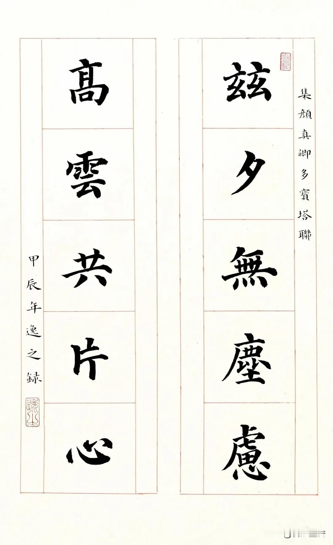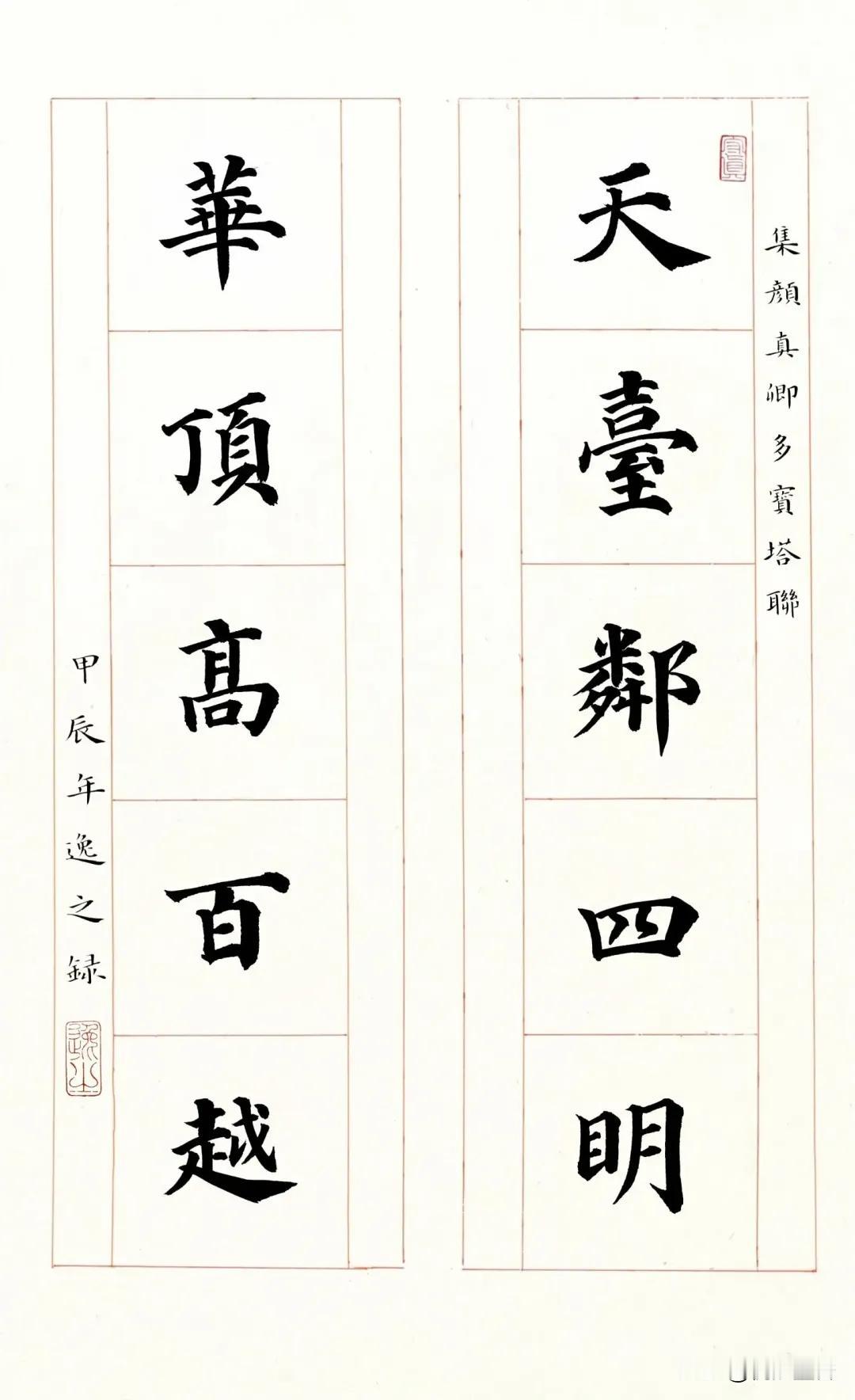 欣赏一下《多宝塔碑》集字的楹联吧,这种美感让人非常舒心! 不同于颜真卿晚年的作品老辣雄强,年轻时写的《多宝塔碑》笔画遒丽,非常的温润,这也是很多书法爱好者喜欢上颜体的原因之一,其宽博,大方,俊秀,挺拔,非常的耐人寻味! #书法##颜体##楷书#