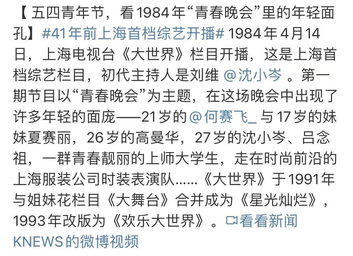 今年5月4日,五四青年节当天,官媒发布了上海电视台首档综艺节目的视频,视频中有青春靓丽的何赛飞、风华正茂的沈小岑,以及意气风发的吕念祖。