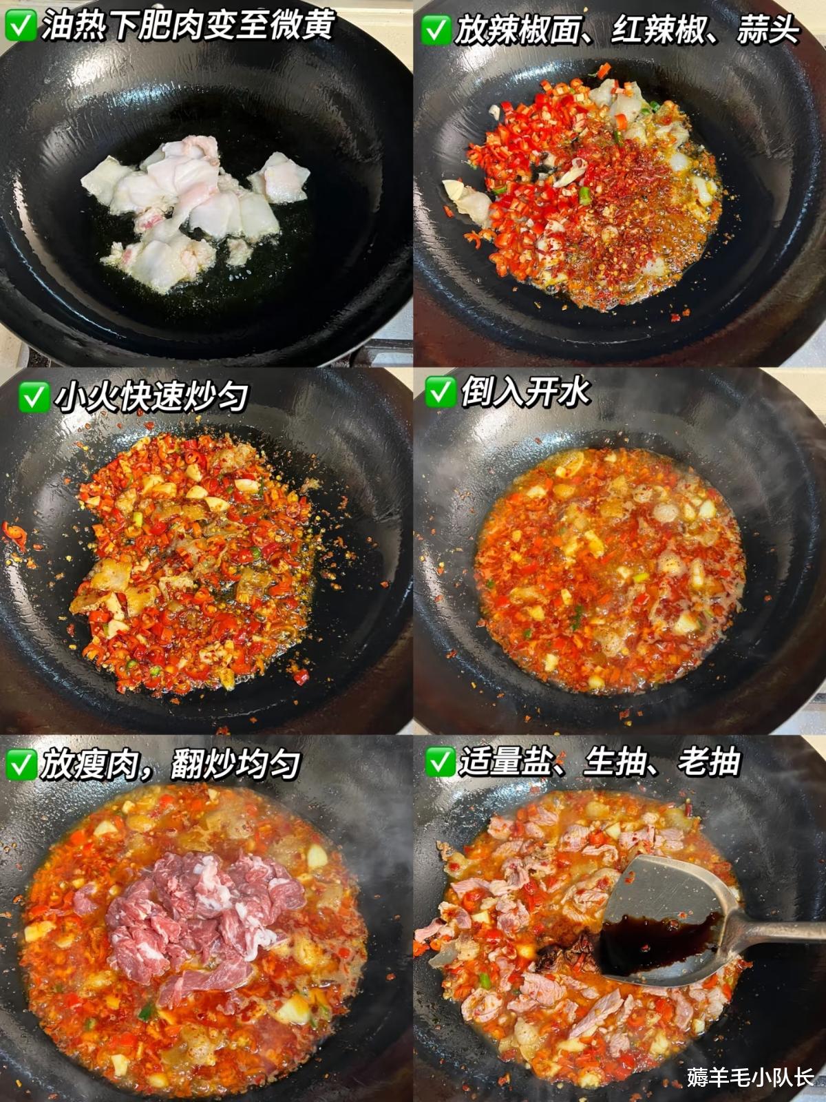肥肉炒至理想状态后,接着放入切好的红辣椒段。红辣椒一下锅,就与热油碰撞出热烈的火花,瞬间散发出浓郁的辣味。快速翻炒几下,让红辣椒均匀受热。紧接着,撒入一大勺辣椒面,辣椒面的香气在热油的激发下瞬间爆发,整个厨房都弥漫着香辣的气息。再放入蒜末,蒜末的香味与辣椒的香味相互交融,形成一种独特的诱人香味。继续翻炒片刻,让各种香味充分融合。
