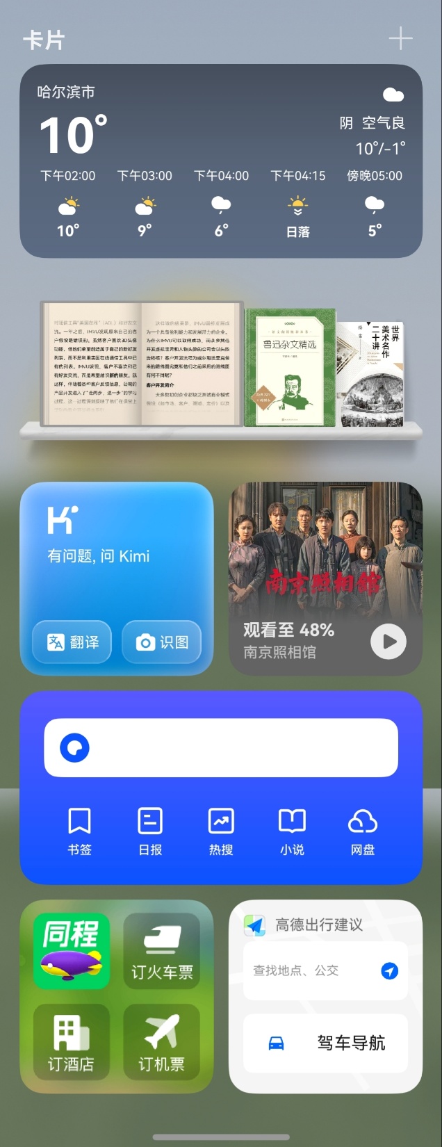 打卡景点、找饭店,高德地图卡片能让我快速规划路线、一键打车。同程旅行卡片则便于我订酒店。