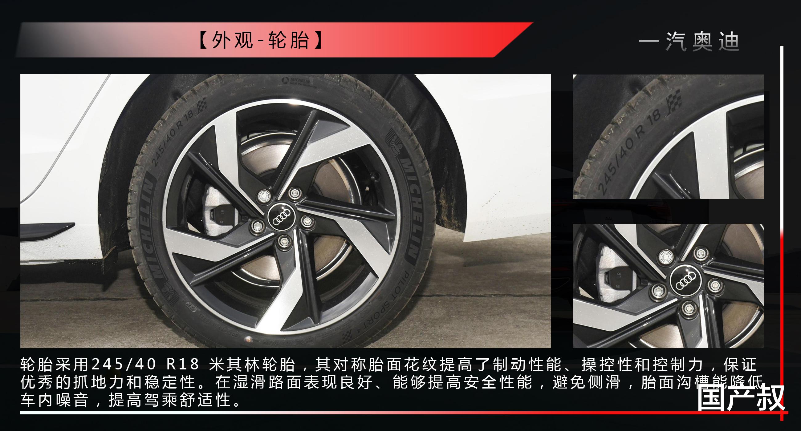 轮胎采用245/40 R18 米其林轮胎,其对称胎面花纹提高了制动性能、操控性和控制力,保证优秀的抓地力和稳定性。在湿滑路面表现良好、能够提高安全性能,避免侧滑,胎面沟槽能降低车内噪音,提高驾乘舒适性。此外,轮毂采用刀锋样式设计,从视觉上看起来具有比较强的运动属性。