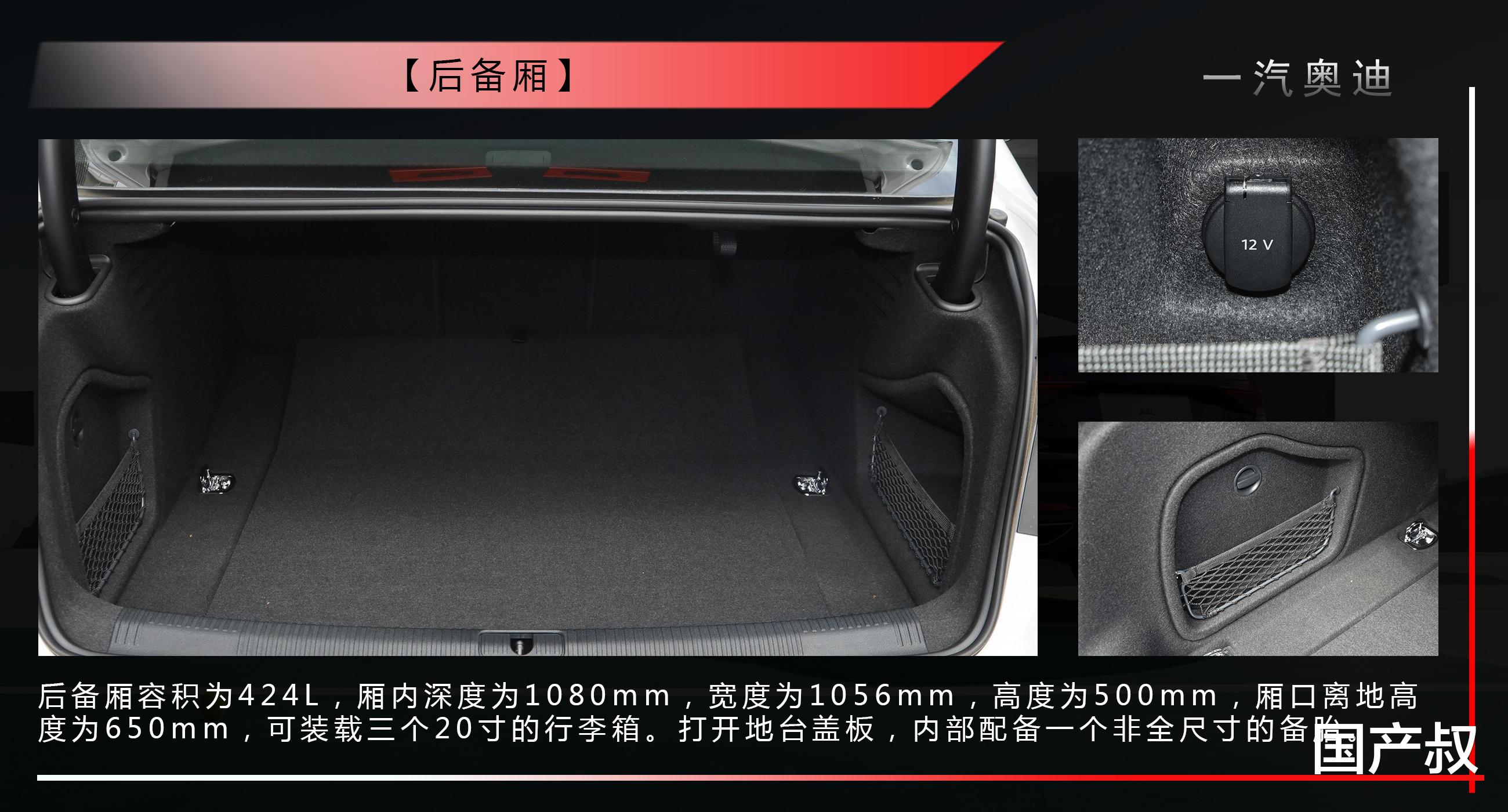 后备厢容积为424L,厢内深度为1080mm,宽度为1056mm,高度为500mm,厢口离地高度为650mm,可装载三个20寸的行李箱。打开地台盖板,内部配备一个非全尺寸的备胎。