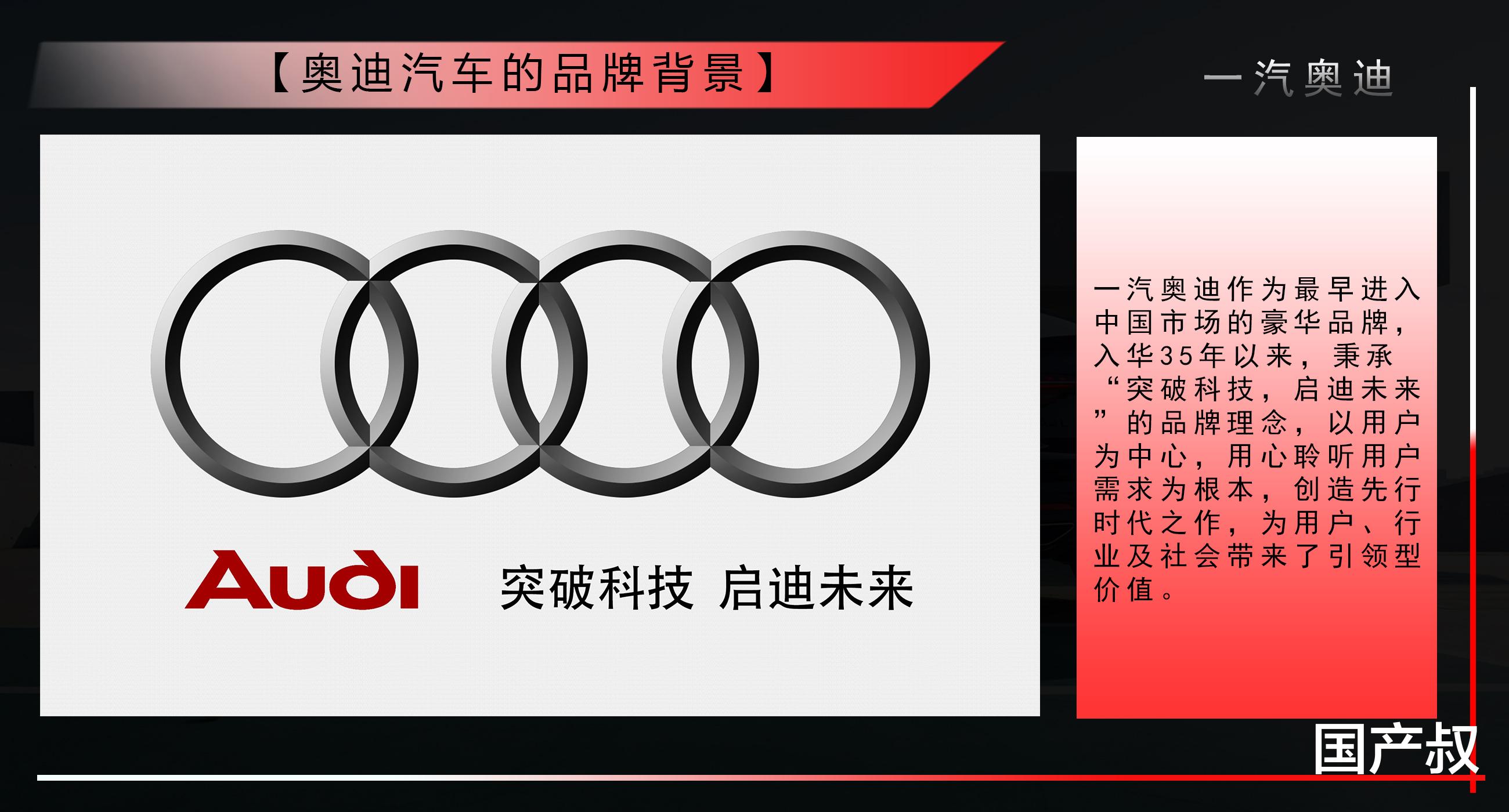 一汽奥迪作为最早进入中国市场的豪华品牌,入华35年以来,秉承“突破科技,启迪未来”的品牌理念,以用户为中心,用心聆听用户需求为根本,创造先行时代之作,为用户、行业及社会带来了引领型价值。秉承“进取”精神理念与未来的品牌态度。同时,在产品技术层面从不止步,以前瞻的战略思考与强大的造车实力,全面推进转型进化,并融入科技与创新,引领用户进入未来高端移动出行的新境界。
