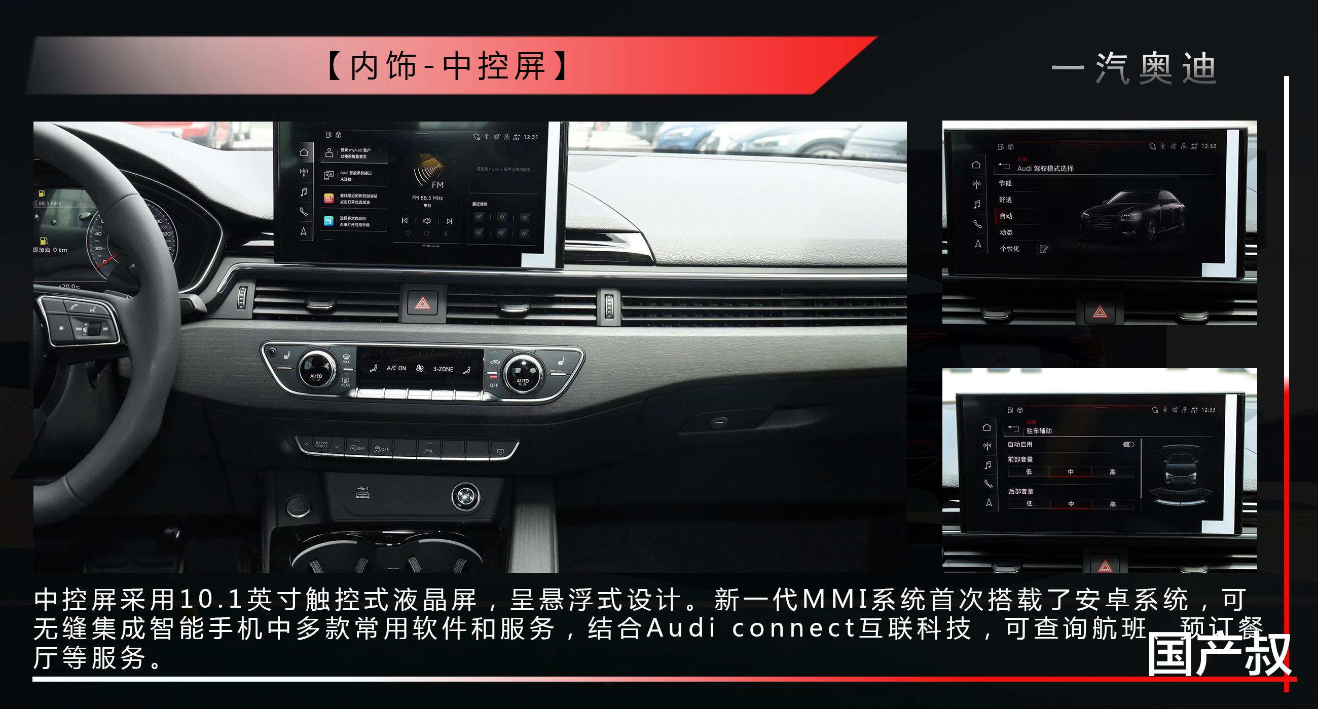中控屏采用10.1英寸触控式液晶屏,呈悬浮式设计。新一代MMI系统首次搭载了安卓系统,可无缝集成智能手机中多款常用软件和服务,结合Audi connect互联科技,可查询航班、预订餐厅等服务。此外,该屏幕操作起来流畅度高,UI界面设计风格清新时尚,滑动屏幕无卡顿,响应速度快,各功能均在此屏幕操作,并支持触屏振动反馈,语音识别控制系统、CarPlay、Android Auto等功能。另外,在车载APP应用市场可下载更多主流的APP,体验更多智能化体验。
