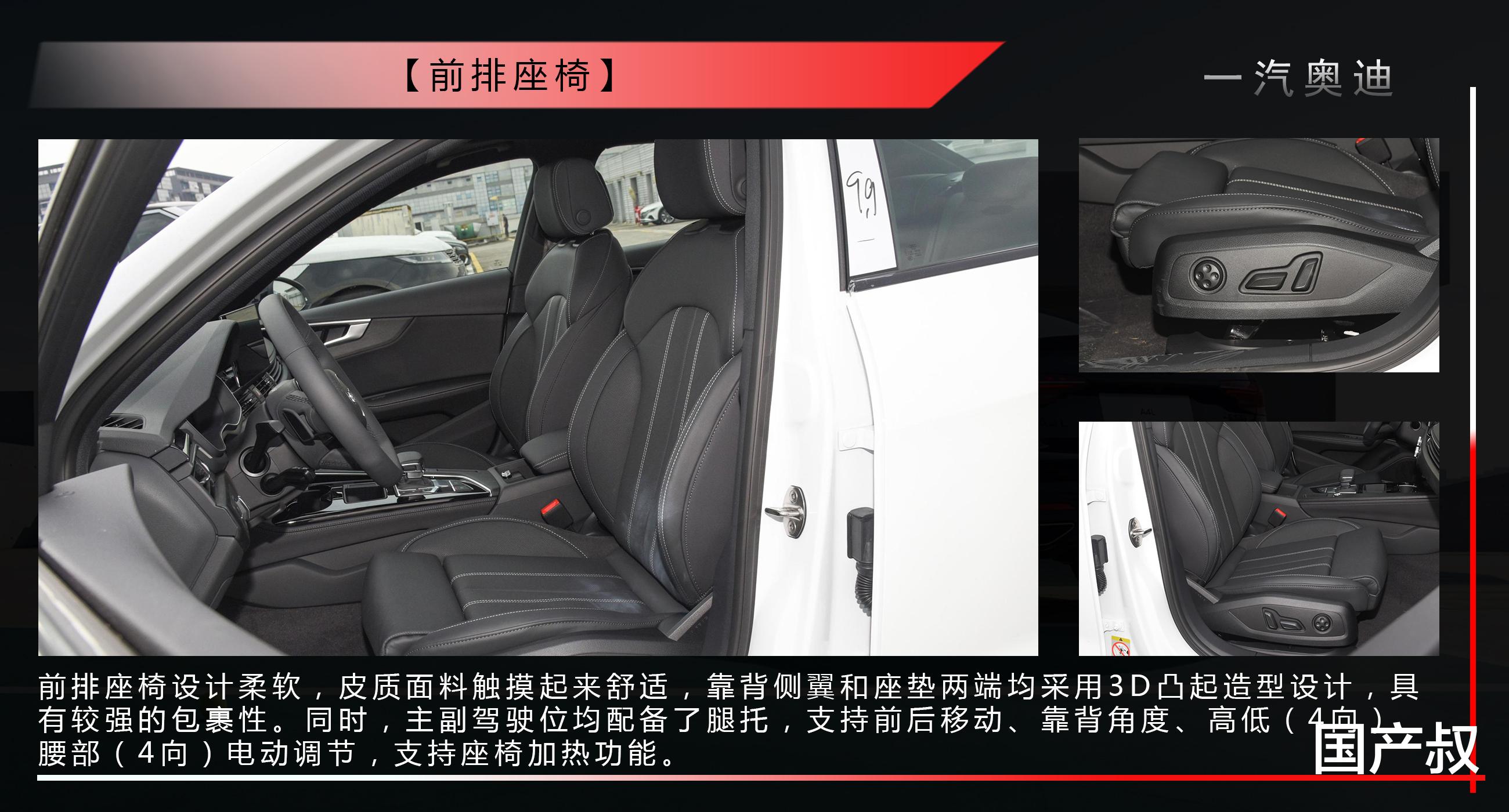 奥迪A4L B&O星夜版采用皮质运动风格座椅设计,前排座椅设计柔软,皮质面料触摸起来舒适,靠背侧翼和座垫两端均采用3D凸起造型设计,具有较强的包裹性。同时,主副驾驶位均配备了腿托,在长途驾驶和乘坐时,腿部得到比较不错的放松,有效缓解腿部充血的情况。另外,支持前后移动、靠背角度、高低(4向)、腰部(4向)电动调节,支持座椅加热功能。我的身高为178cm,乘坐于主驾驶位,将座椅调节至舒适坐姿,前排头部余留空间约有一拳一指,腿部活动空间较大。
