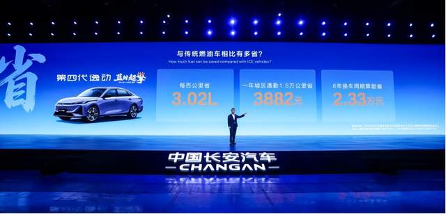 其次用车成本显著降低。在发布会现场,长安汽车执行副总裁杨大勇为消费者算了一笔账:以第四代逸动蓝鲸超擎为例,城区实测百公里综合油耗约2.98升,对比同级传统燃油车6升油耗估算,每百公里能省下3.02升油。按一年跑1.5万公里,一年省油453升,结合92号汽油当前8.57元/升计算,一年就省下3882元。按6年换车周期,光油费就能省下2.33万元。以一台12万的车为例,对比保险费,燃油车比纯电车每年约节省1000元,对比保值率,燃油车比纯电车三年后多卖7200元。从油耗表现、二手车残值、保险成本、时间成本等多维度实现全生命周期用车成本更低,让用户全程省心、持续省钱。