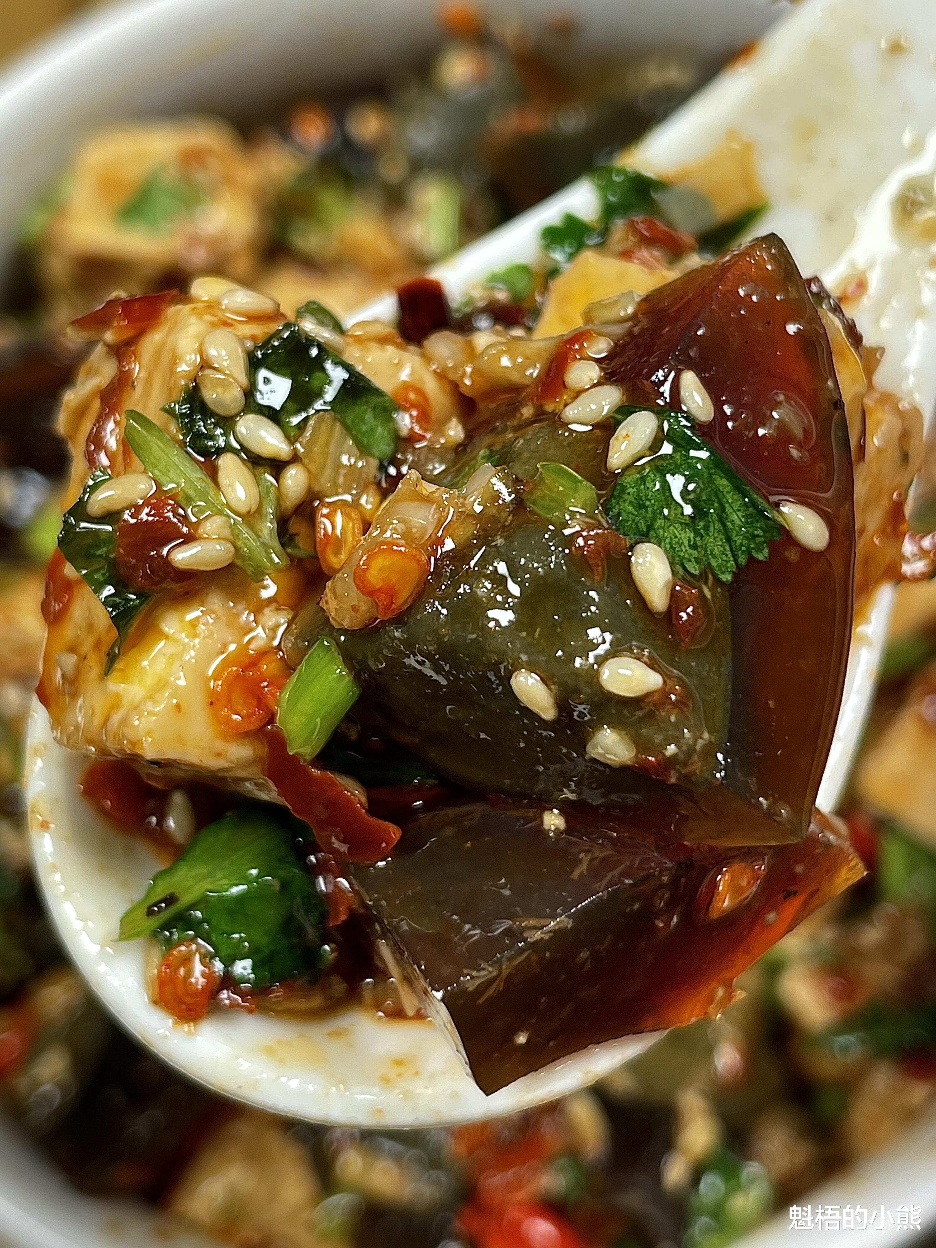 夹一块豆腐,裹着酱汁,嫩滑鲜香,入口即化;再来一块皮蛋,醇厚入味,越嚼越香。最绝的是舀1勺酱汁拌进米饭里,白米饭瞬间染成红亮的颜色,酸辣开胃,能多吃1碗。夏天没胃口的时候,来1盘,整个人都清爽了;大鱼大肉后来几口,解腻又舒服。
