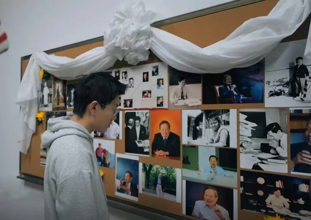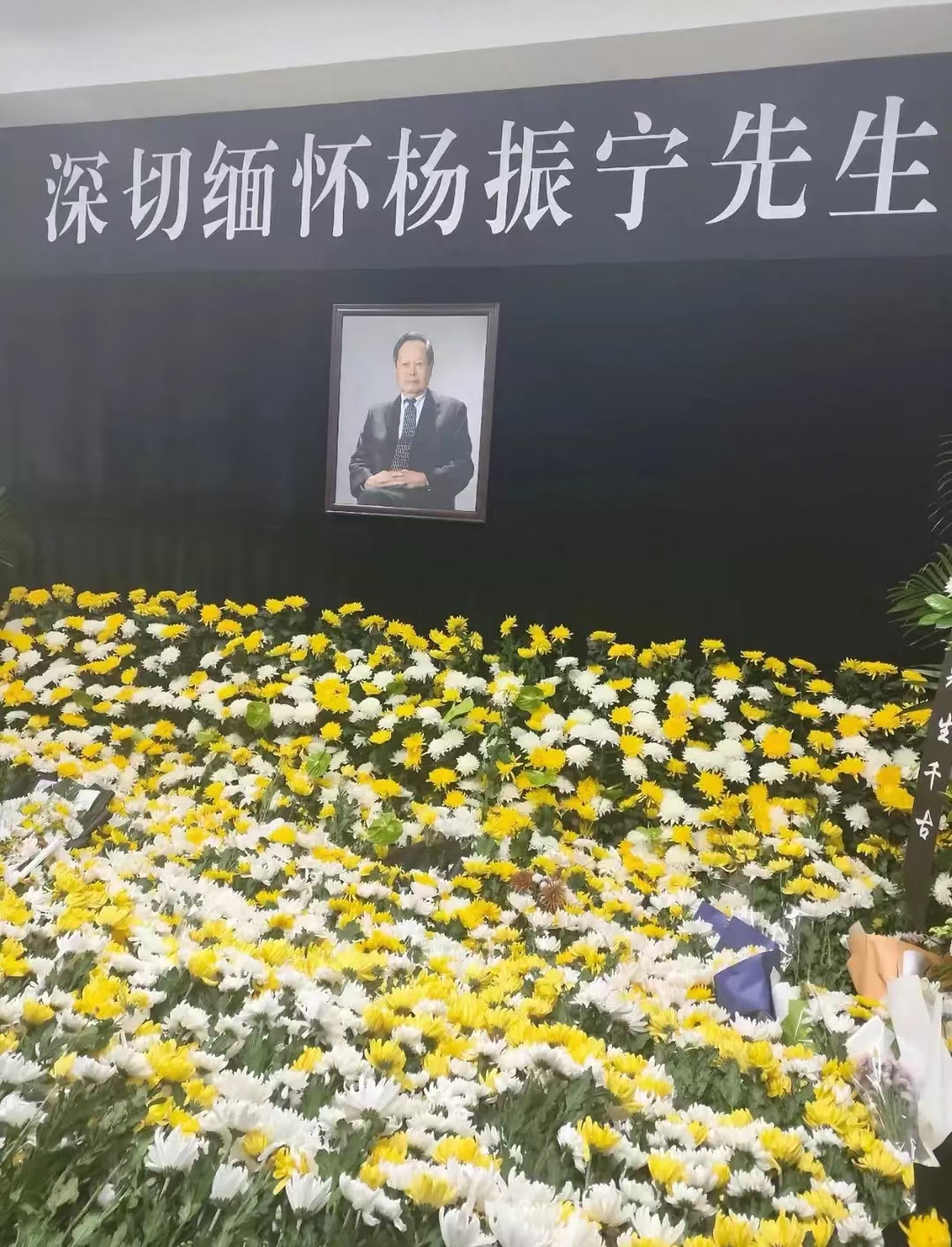 杨振宁先生逝世后,清华大学是第一时间就在校园里办了一个缅怀室。室内摆满了黄白菊花,全校的师生都去悼念这位伟大的物理学家,鲜花多到摆满了整个室内外。