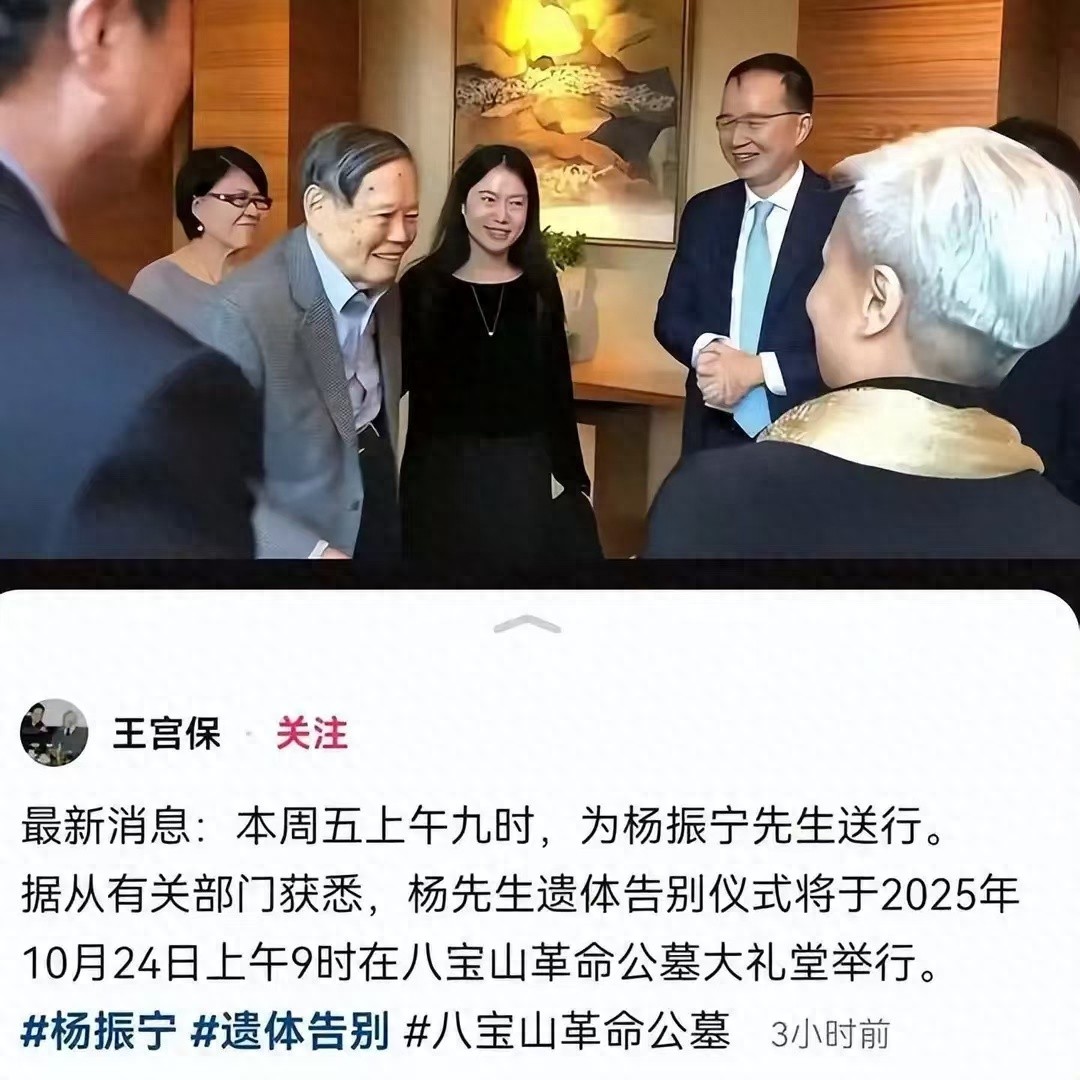 10月21日,身为全国政协委员的王宫保爆料,杨振宁的墓地已经确定好定在哪里,并公布了追悼会的细节和时间安排。确定了在10月24号上午9时举行送别仪式,然后杨振宁先生的骨灰将会安葬在八宝山革命公墓,追悼仪式也在八宝山举行。有想去送杨振宁先生最后一程的朋友,看到这个消息应该很欣慰吧!