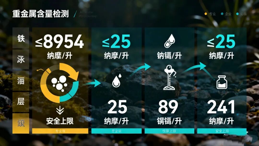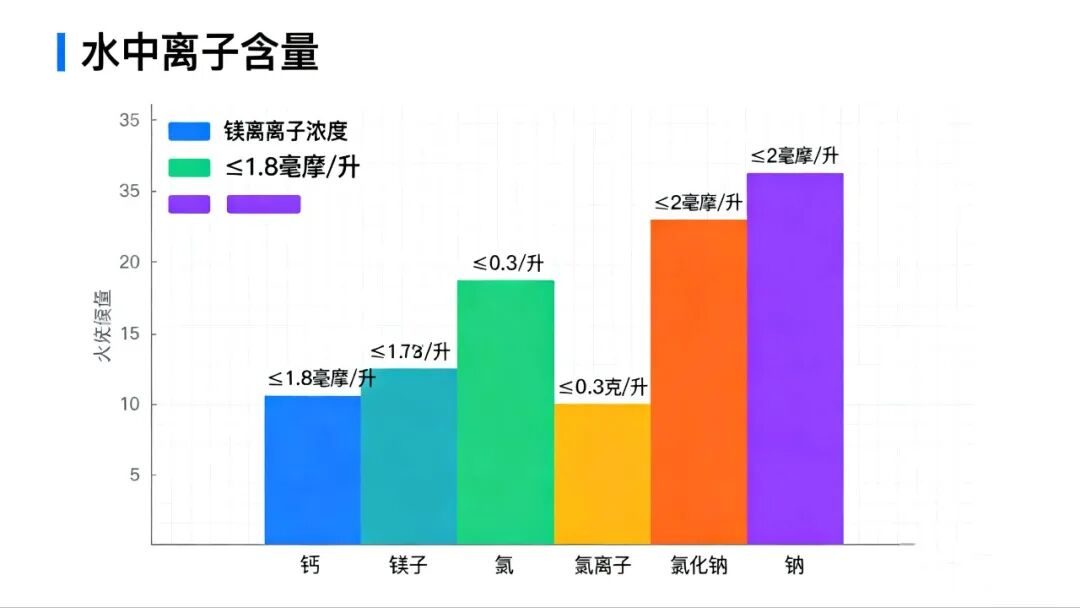 比如:水当中的氯化钠浓度情况,一般需要小于2豪摩/升。重金属含量,铁小于8954纳摩/升,汞小于25、镉小于89、砷133、硒12.7、铅241、铜1574、锌3059等等。