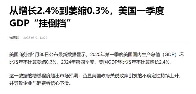 2025年4月30日,美国商务部公布了美国第一季度的GDP变化,环比按年率计算萎缩了0.3%,而在2024年第四季度,美国GDP环比按年率计算增长2.4%。