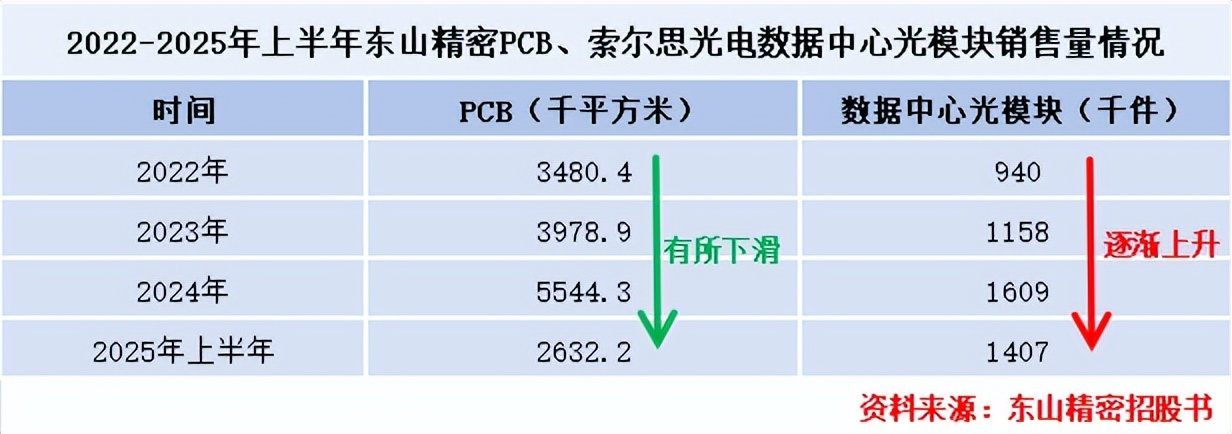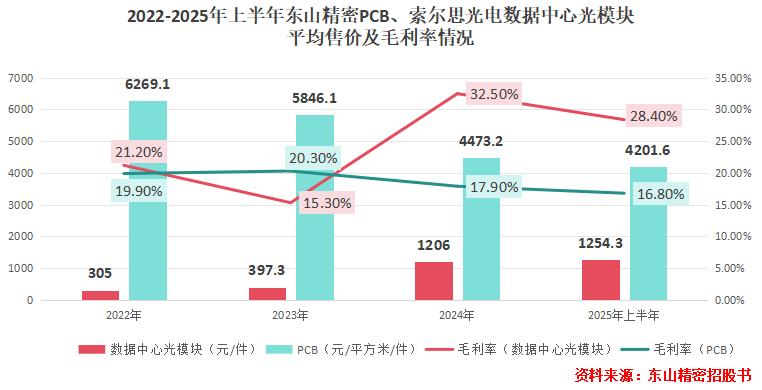 2022-2025年上半年,东山精密PCB产品整体均价逐年下滑,从6269.1元/平方米/件下滑到4201.6元/平方米/件;索尔思光电的数据中心光模块则与之形成鲜明对比,每件均价从305元激增到1254.3元。