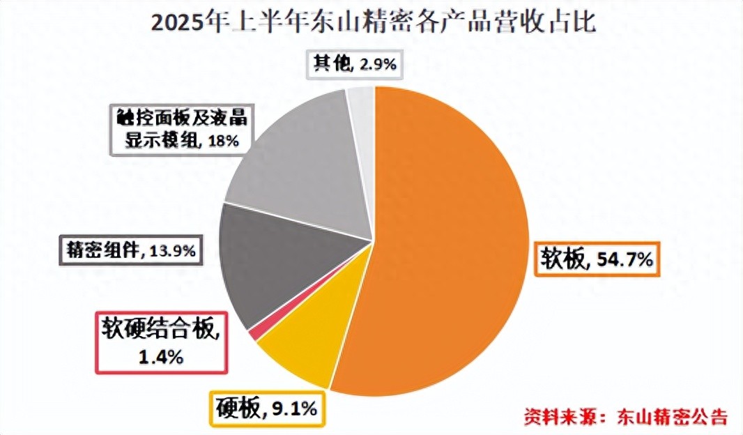 不过,或许是入场较晚,2025年上半年,东山精密PCB产品中,营收占比最大的还是软板,占比54.7%;而硬板仅占比9.1%。