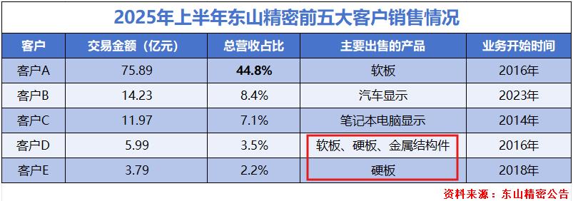 2025年上半年,东山精密前五大客户中,硬板产品只出现在第四、第五名客户的“主要出售产品”中,且这两大客户合计交易金额不足10亿元,合计总营收占比为5.7%。